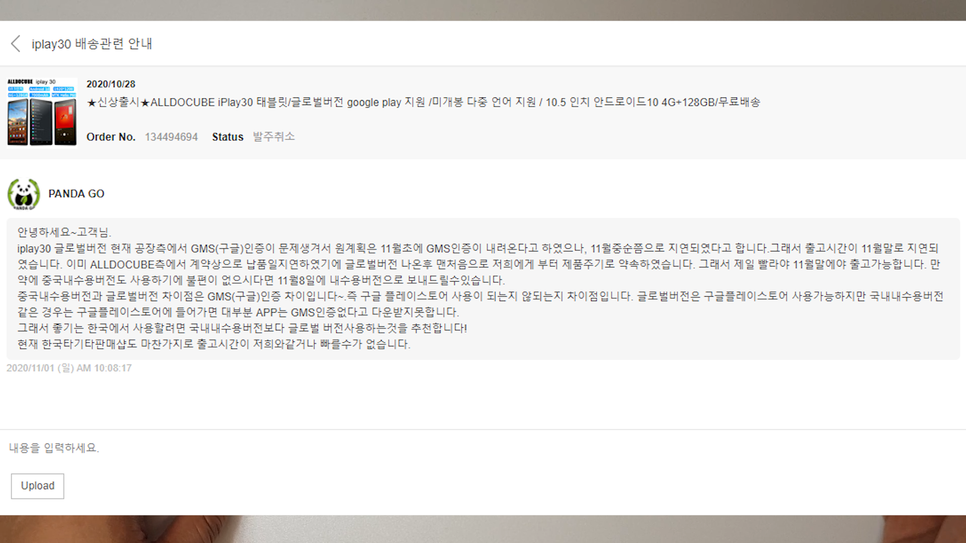 그러나 아쉽게도 iplay 30 글로벌 제품에 구글 인증 문제가 생겨서 배송이 11월 말로 지연 되었다는 메일을 받게 되었습니다. 저는 급하게 태블릿을 받아볼 필요는 없어서 일단 관망하기 위해서 iplay30은 배송지연으로 구매는 취소했습니다.