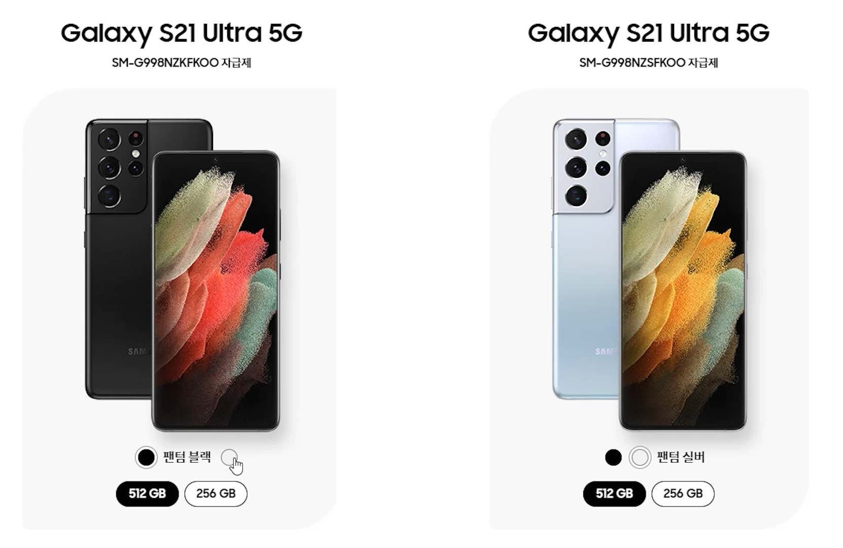 갤럭시 S21 울트라 색상은 팬텀 블랙, 팬텀 실버 이렇게 2가지 색상만 있습니다.