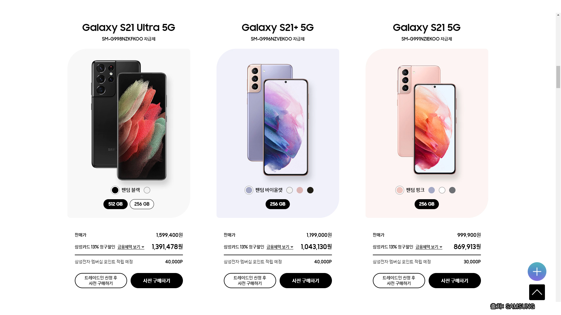 가격은 S21 울트라 제품이 1,599,400원, S21+ 1,199,000원, S21 999,900원 입니다.