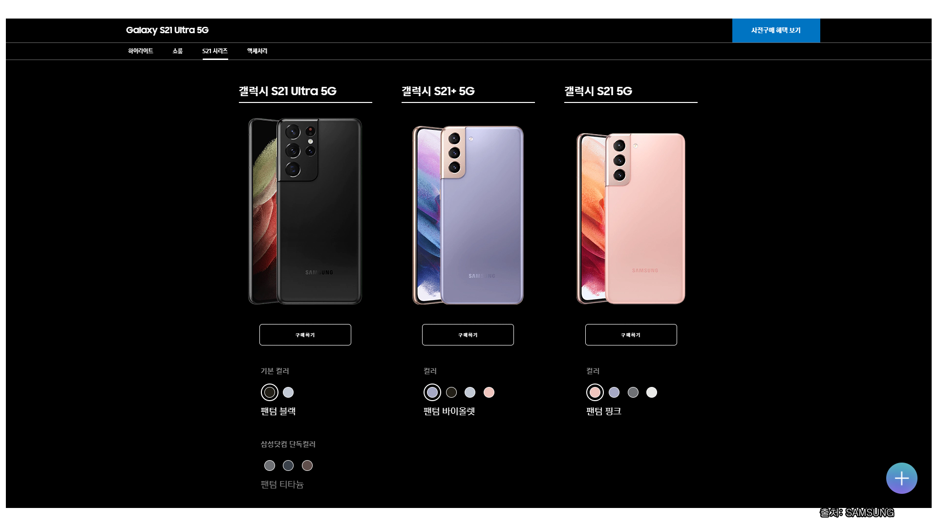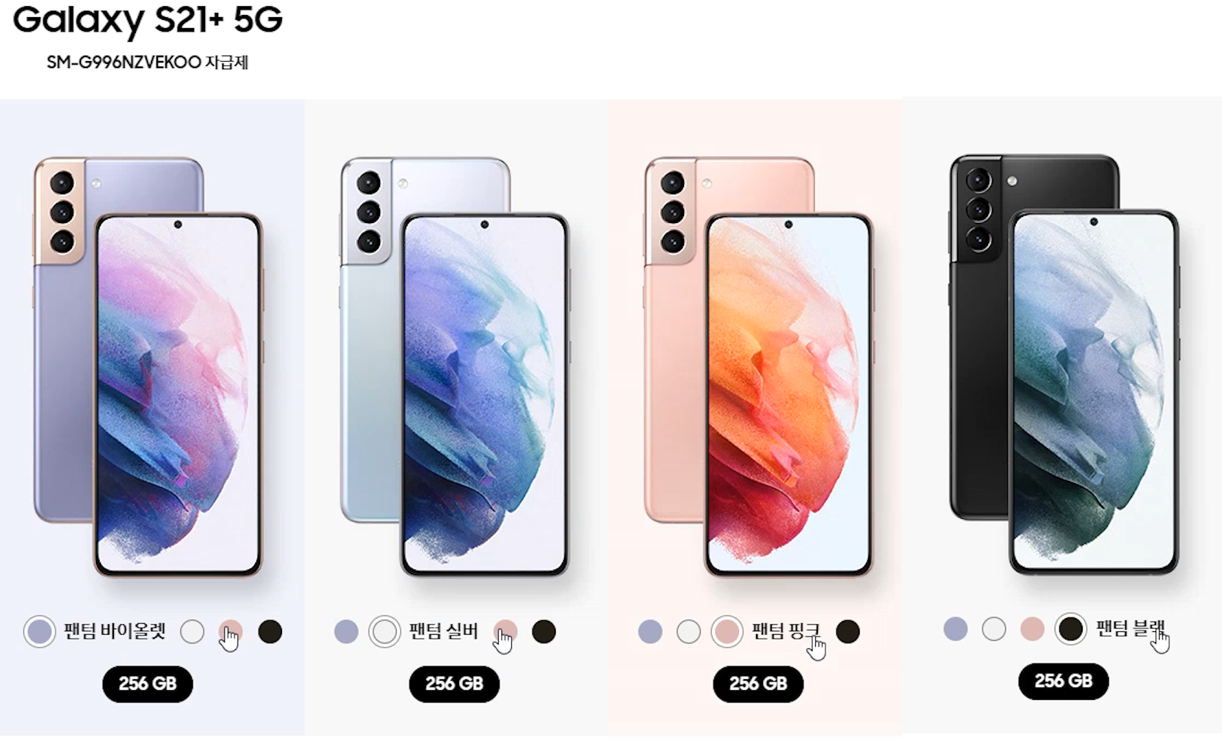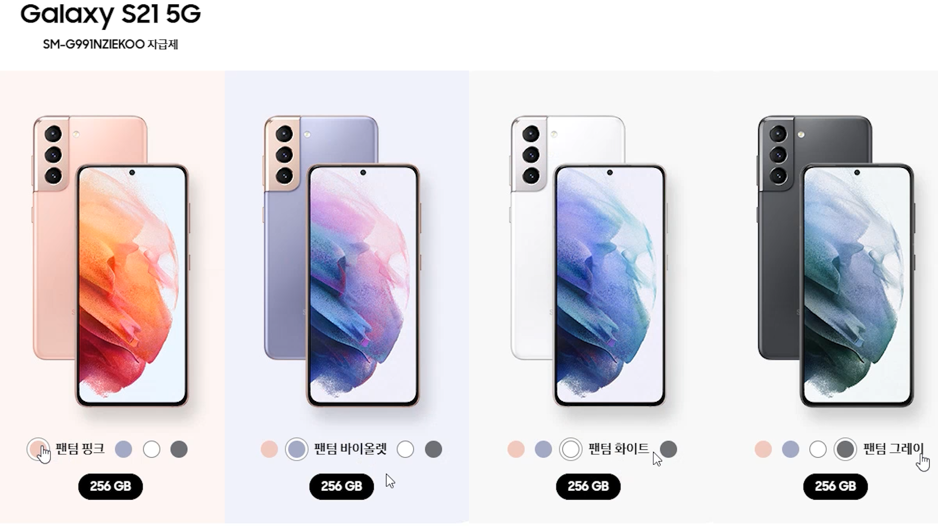갤럭시 S21은 팬텀 핑크, 팬텀 바이올렛, 팬텀 화이트, 팬텀 그레이 이렇게 4가지 색상으로 출시됩니다.