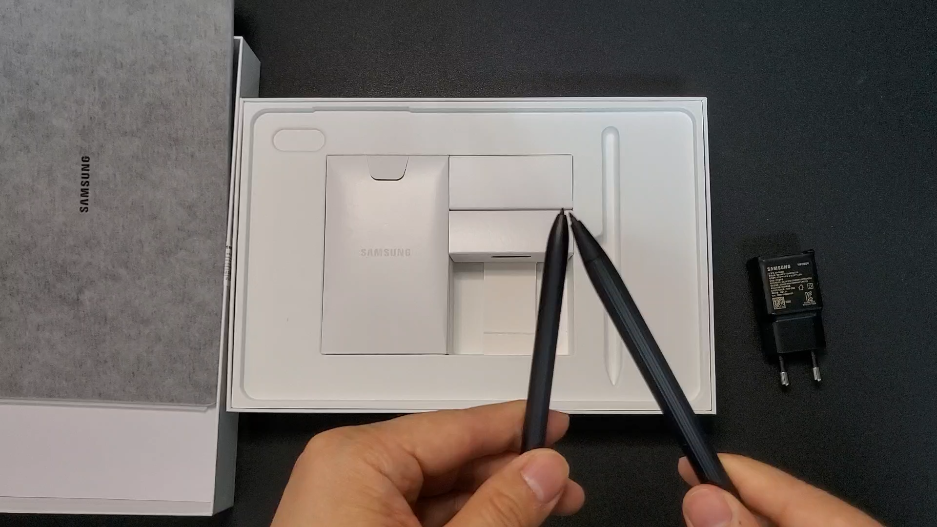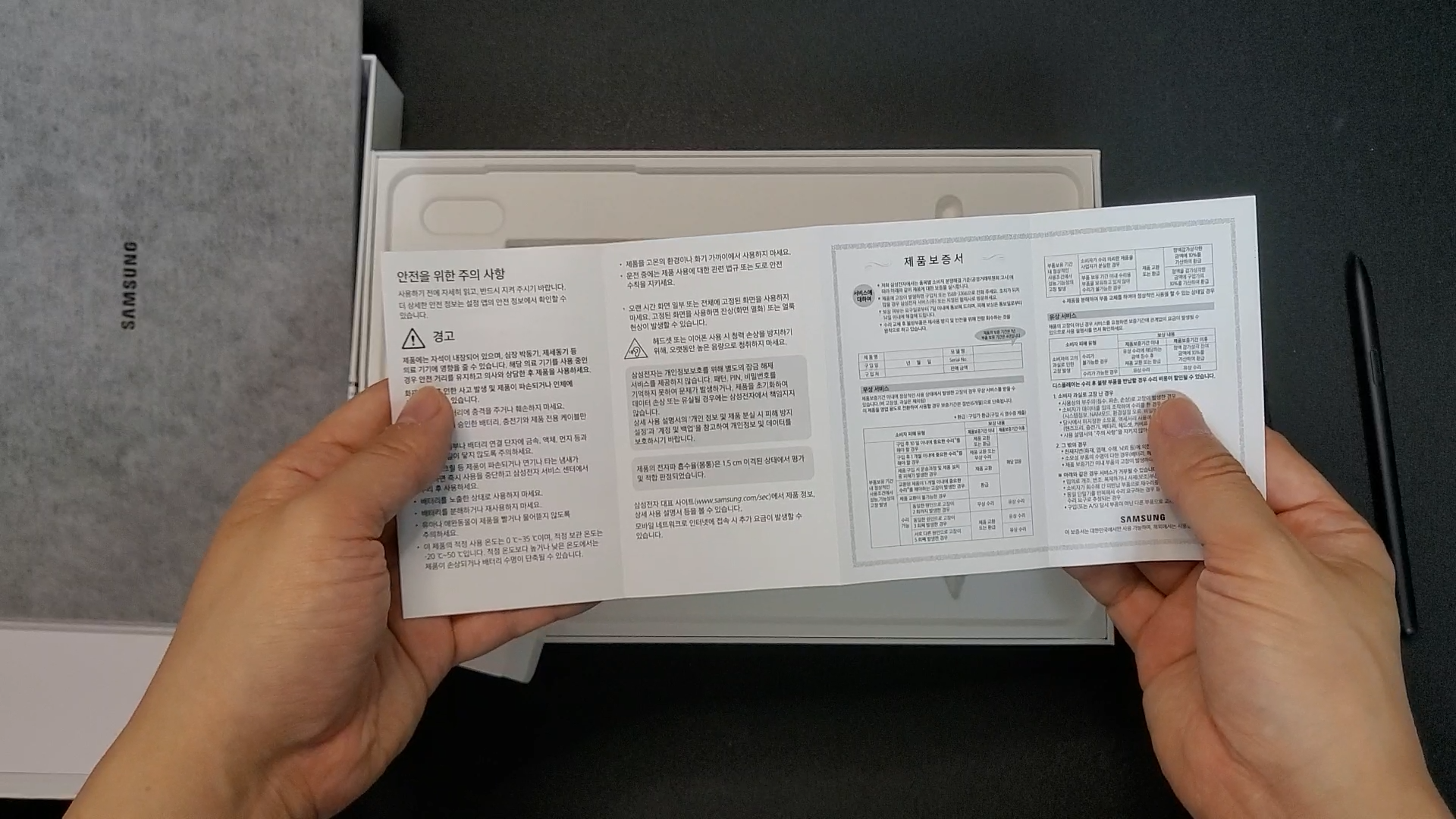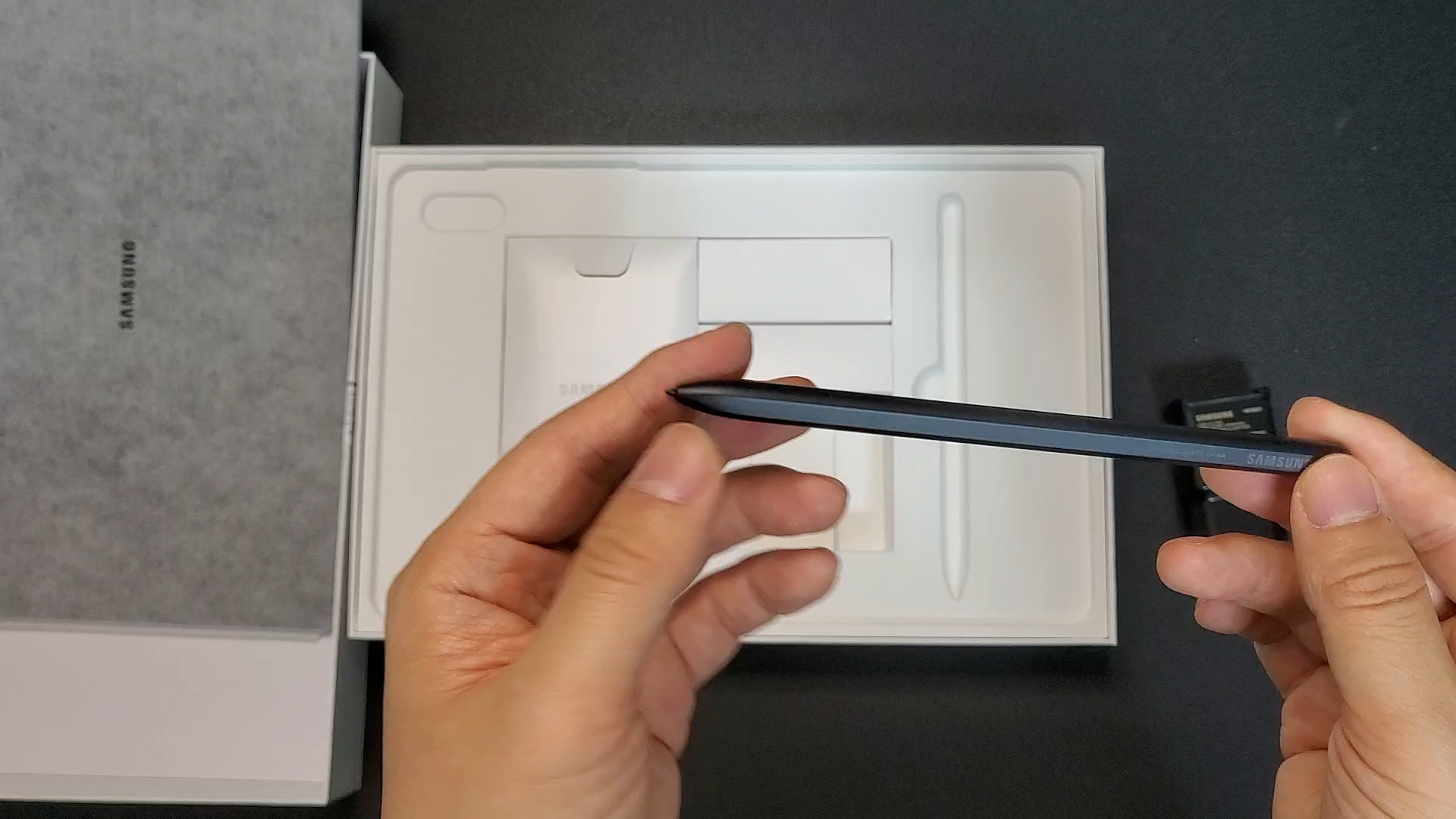 그 특유의 깜빡임을 좋아하진 않아요 이건 전에 영상에서도 한번 다룬적이 있는데 그래서 이제 LCD를 더 선호하는 스타일이구요 뭐가 더 좋다 나쁘다 이건 아니에요 그냥 개인 취향이고 그냥 저는 그 깜빡임이 싫을 뿐이에요 뒤쪽에는 와콤펜을 부착하라고 되어 있죠 이게 방향 있다고 했는데? 이렇게 부착을 하면 되겠네요 그리고 삼성 마크가 있고 AKG 사운드 라고 되어 있네요