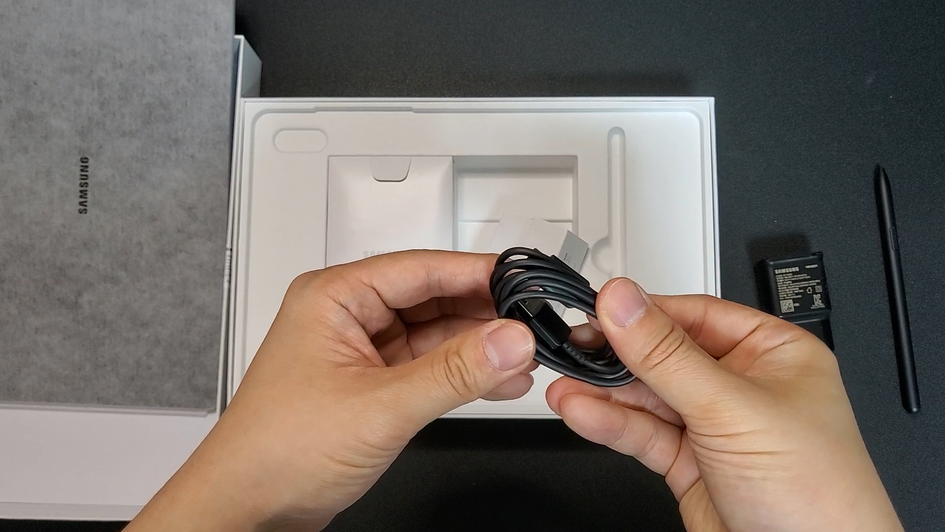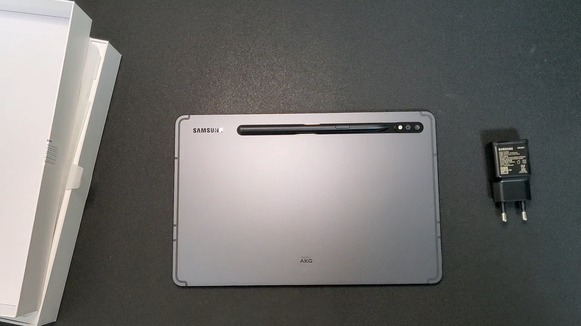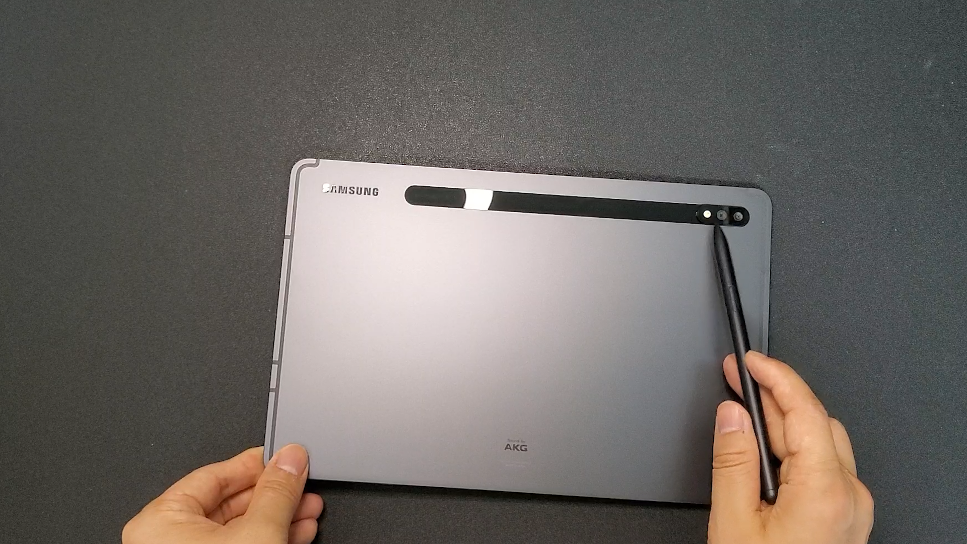 그 특유의 깜빡임을 좋아하진 않아요 이건 전에 영상에서도 한번 다룬적이 있는데 그래서 이제 LCD를 더 선호하는 스타일이구요 뭐가 더 좋다 나쁘다 이건 아니에요 그냥 개인 취향이고 그냥 저는 그 깜빡임이 싫을 뿐이에요 뒤쪽에는 와콤펜을 부착하라고 되어 있죠 이게 방향 있다고 했는데? 이렇게 부착을 하면 되겠네요 그리고 삼성 마크가 있고 AKG 사운드 라고 되어 있네요