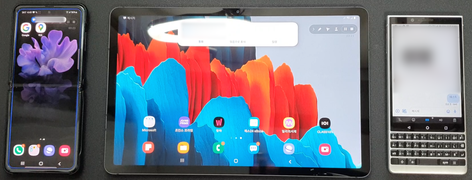 아이패드와 갤럭시 태블릿과 그다음 핸드폰 세 개가 동시에 연동되지는 않고 결국에는 하나의 제품을 선택을 해야 돼요