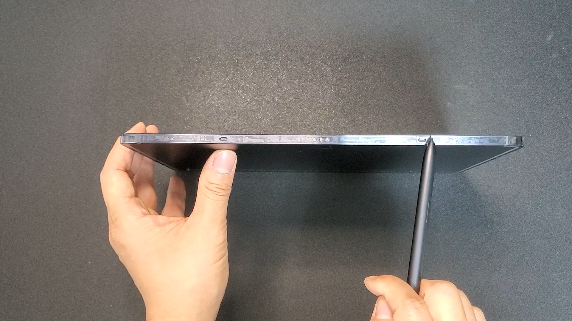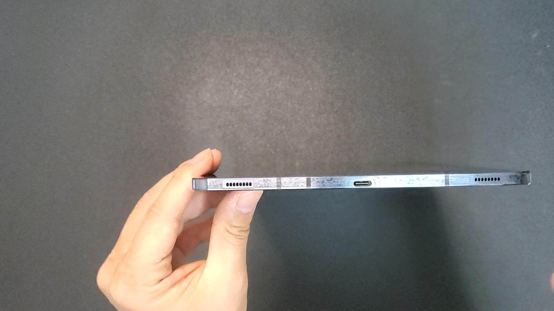 돌려서 보면은 쿼드 스피커가 있고요 그다음에 C 타입 충전 포트가 보입니다