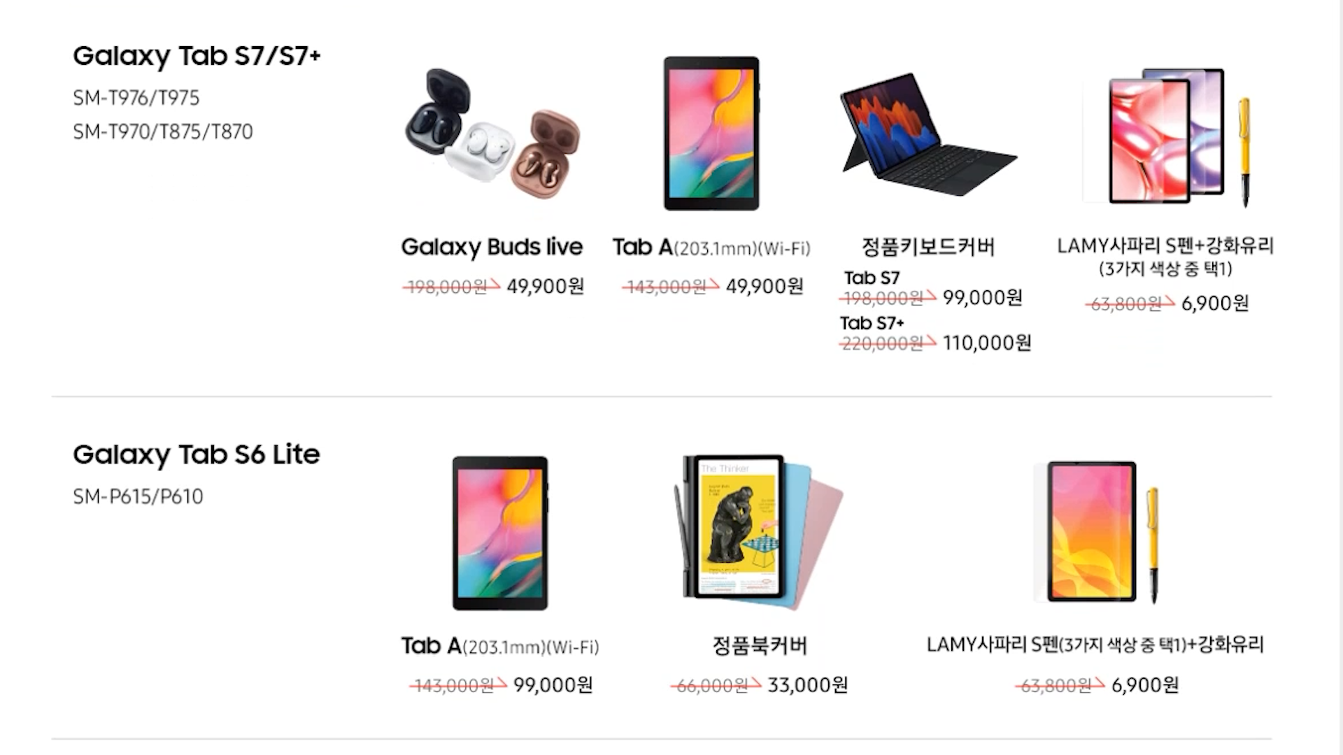 갤럭시 버즈 라이프 49,900원, 갤럭시탭A 49,900원, 갤럭시탭 S7 정품 키보드 99,000원, 사파리 S펜 6,900원
