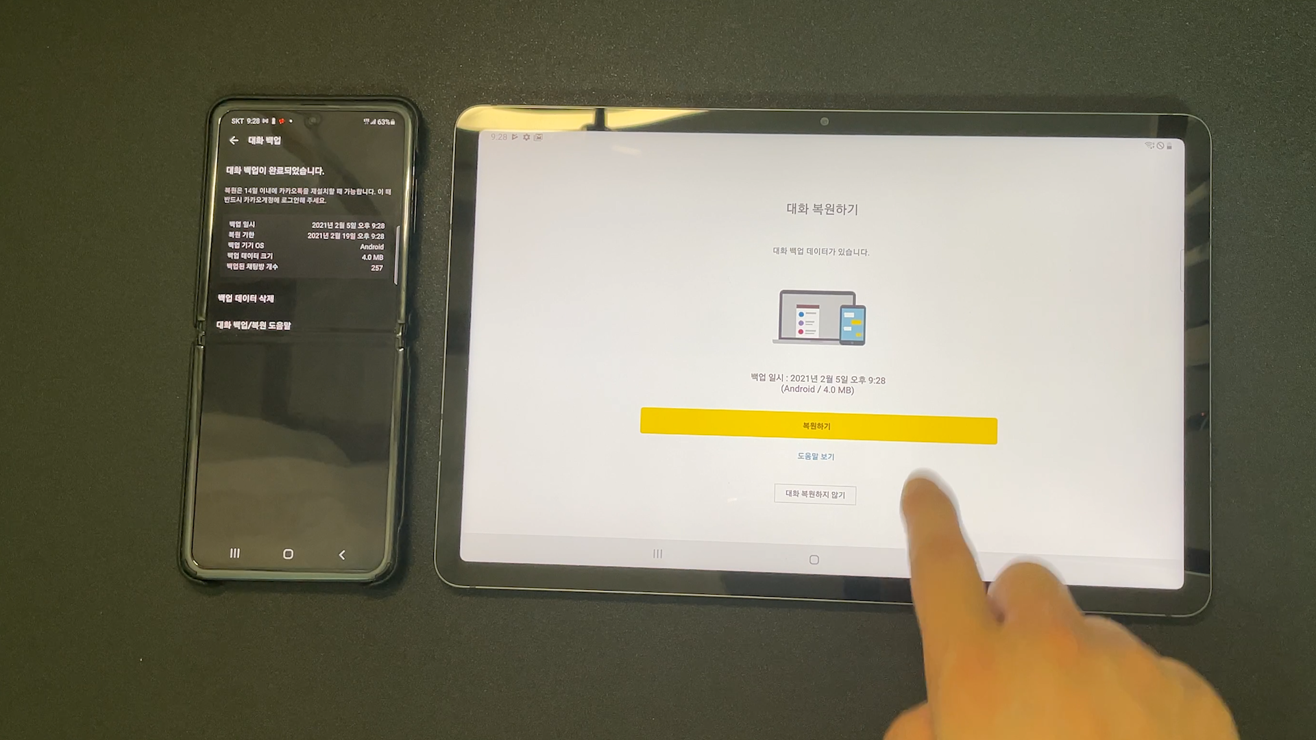 미리 카카오톡 백업 부터 했어야 했는데 잠깐만요 먼저 백업을 해 볼게요 2021년도 2월 5일로 다시 떴어요 다행이네요 다시 설치 할 필요 없이 그냥 중간에 하다가 백업이 안됐으면 백업하고 이어서 하면 될 것 같아요 복원하기 누르겠습니다. 대화 복원이 완료가 되었습니다 이렇게 해서 카카오톡을 사용할 수 있습니다