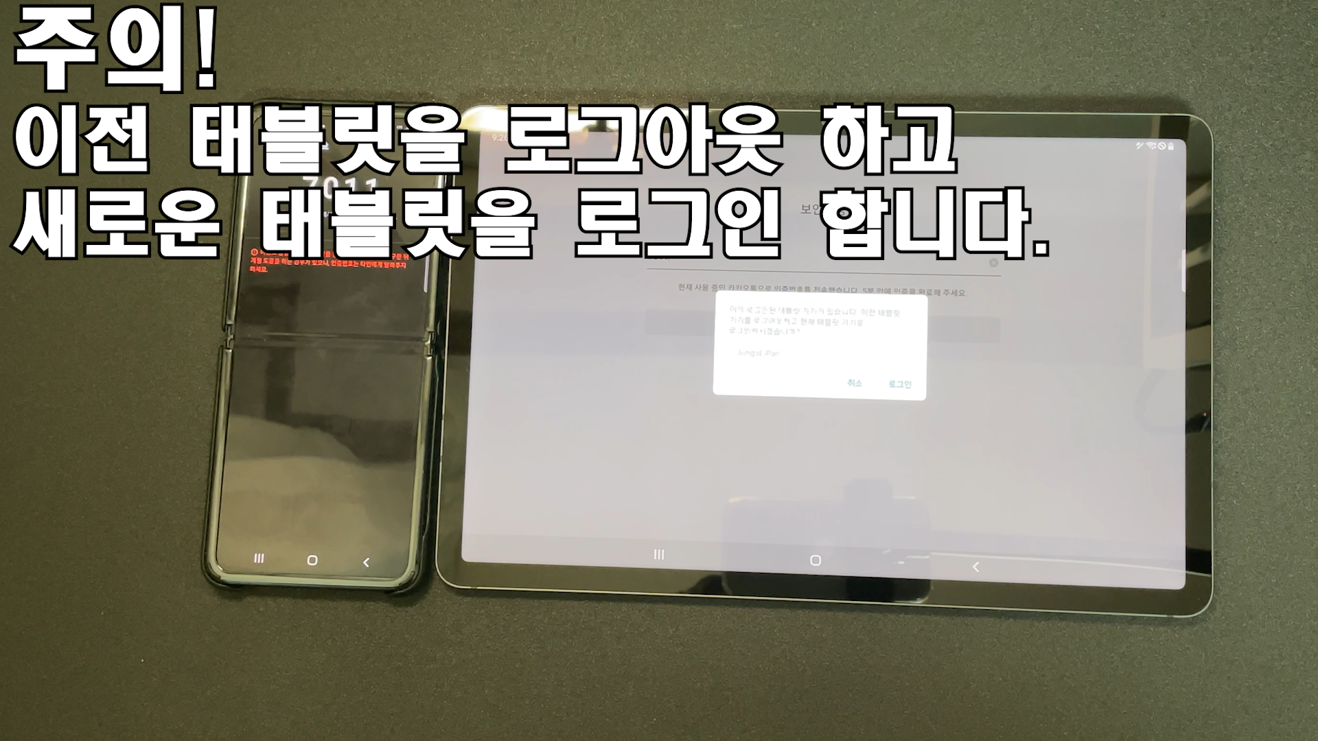 아이패드에서 로그인 돼 있기 때문에 이미 로그인된 태블릿 기기가 있어서 태블릿 기기를 로그아웃하고 현재 태블릿 기기를 로그인 하시겠습니까? 아이패드 하고 갤럭시탭이 있으면 하나 밖에 안 된다는 거네요 그 아이패드하고 핸드폰하고 갤럭시탭하고 세 개를 동시에 못하게 되어 있나 보네요