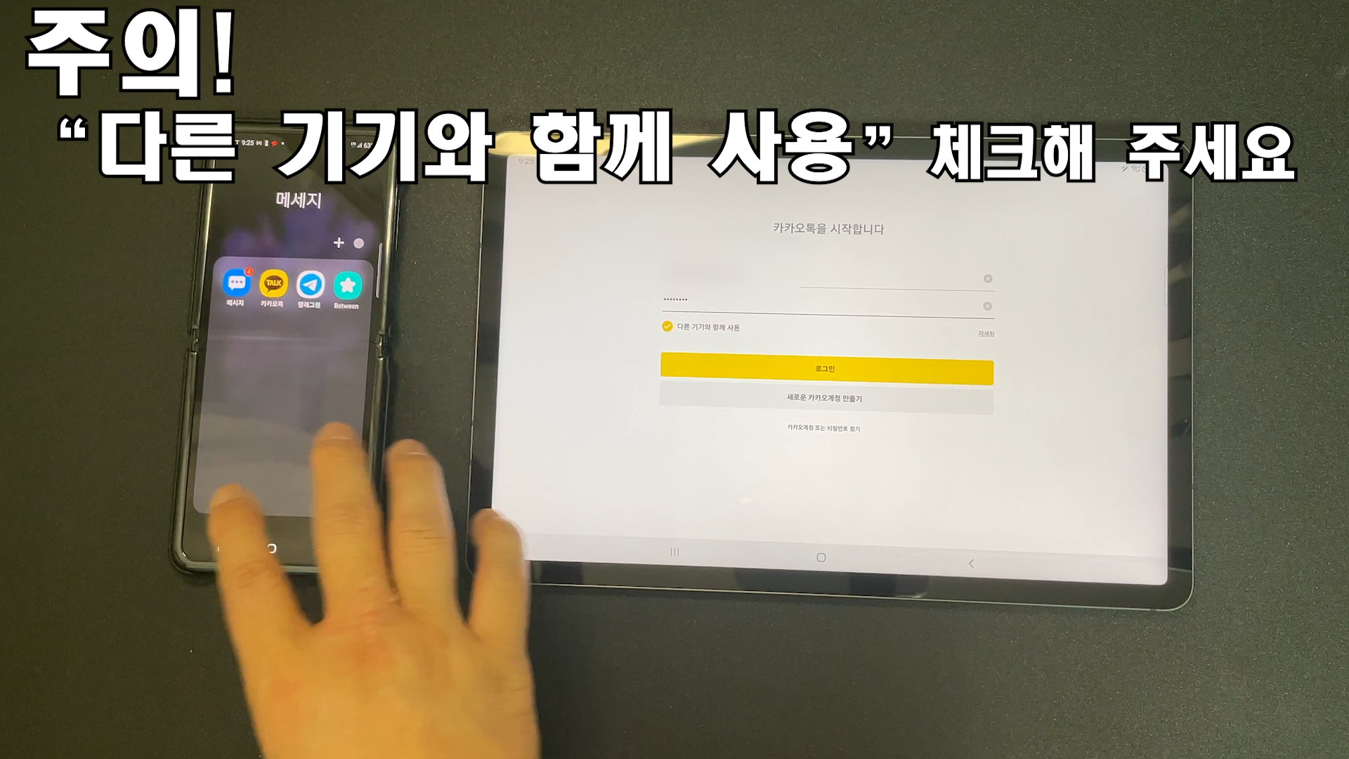저는 다른 기기에서 함께 사용할 거기 때문에 다른 기기 함께 사용을 체크를 한 다음에 로그인을 하겠습니다 인증 번호가 왔어요 탭S7에서 보안 인증 번호 요청했습니다