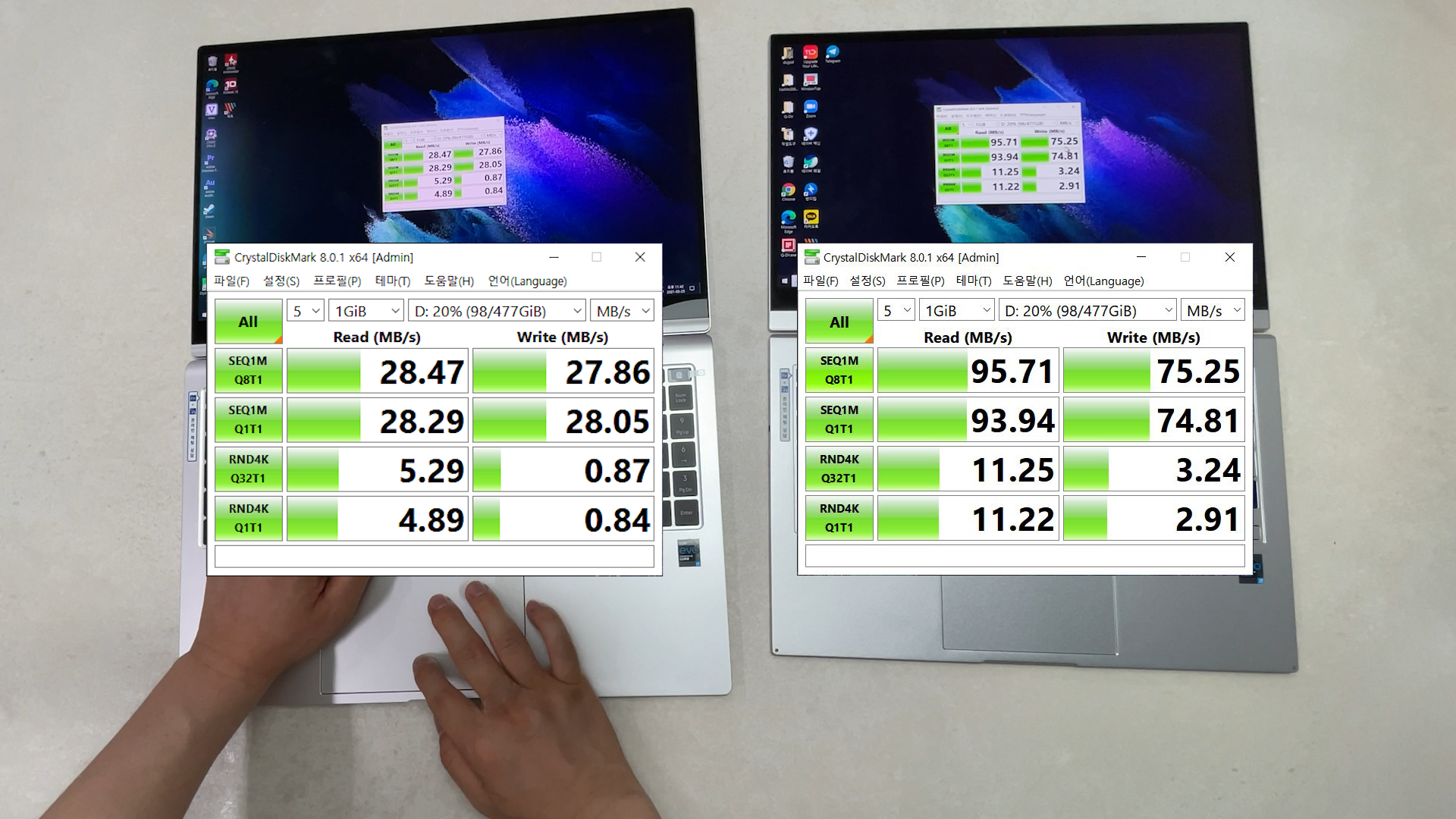삼성 갤럭시북 프로 360 microSD 카드 리더기에다 넣고 테스트 했을때는 읽기 속도가 원래 100MB/s 나와야 하는데 28MB/s 밖에 안 나왔고 쓰기 속도는 90MB/s 나와야 되는데 27MB/s 밖에 안 나오네요