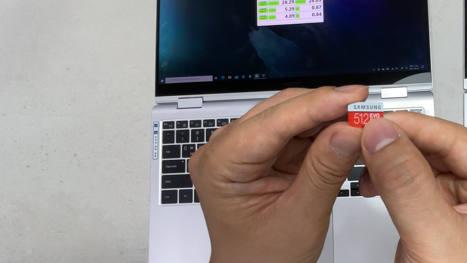 microSD 카드를 빼겠습니다 삼성 512GB EVO Plus microSDXC1 U3 제품입니다 읽기 속도가 100MB/s 쓰기 속도가 90MB/s 제품인데 실제 속도는 갤럭시북 프로 360 microSD 카드 리더기 속도가 느린 것을 알 수 있지요 이번에는 갤럭시 Flex2 5G에 테스트 결과 원래 micorSD 카드 속도와 거의 근접하게 나왔어요 읽기가 95MB/s, 쓰기가 75MB/s 나왔는데 지금 굉장히 속도 차이가 많이 나지요