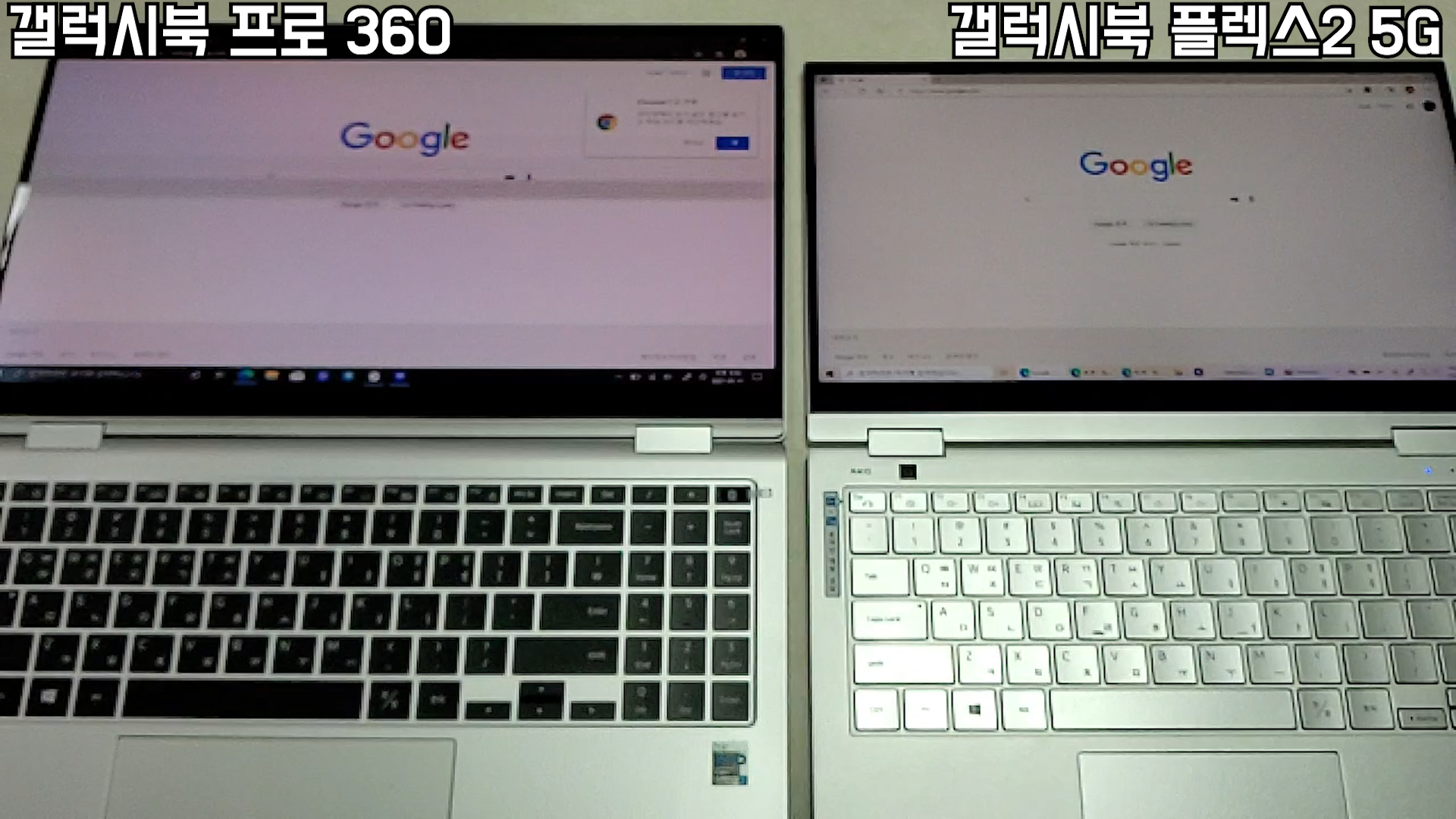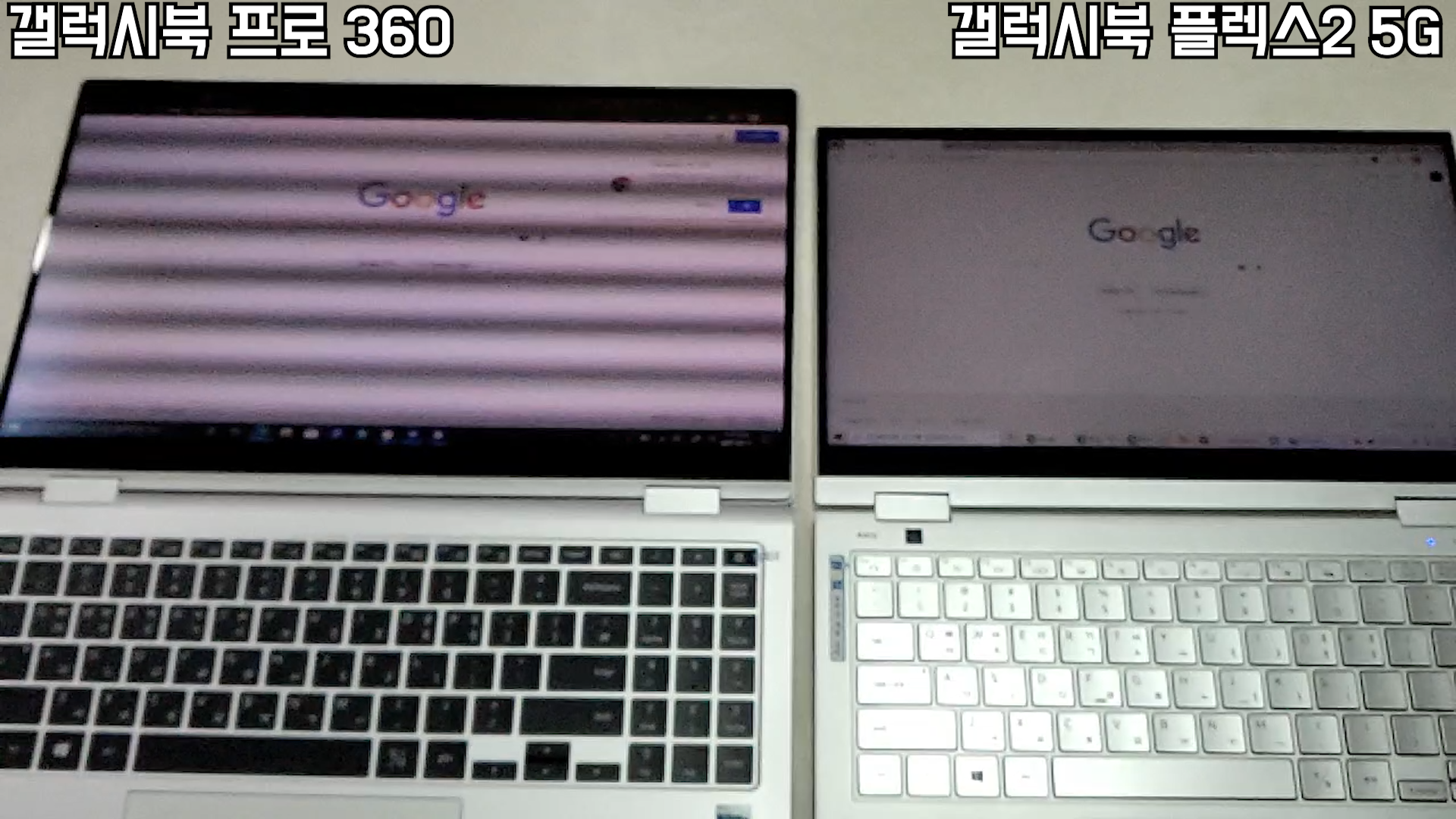 플리커링 같은 경우는 지금 보시면은 갤럭시북 Flex2 5G 같은 경우는 플리커링이 없어요 깔끔한 화면을 보여 주고 있습니다 근데 지금 갤럭시북 프로 360 같은 경우는 굉장히 많이 깜빡이죠? 이게 밝기가 중간입니다 플리커링 지금 너무 심해요 실제 육안으로는 보이지 않지만 셔터 스피드를 조정해서 촬영하게 되면 이렇게 화면을 볼 수 있고 양쪽을 비교했을 때 차이가 확나죠? 이거를 계속 저희가 눈으로 보면서 문서 작업도해야 되고 이것저것 해야 되는데 깜빡 깜빡거리는 화면을 보면 피로할 수 밖에 없어요