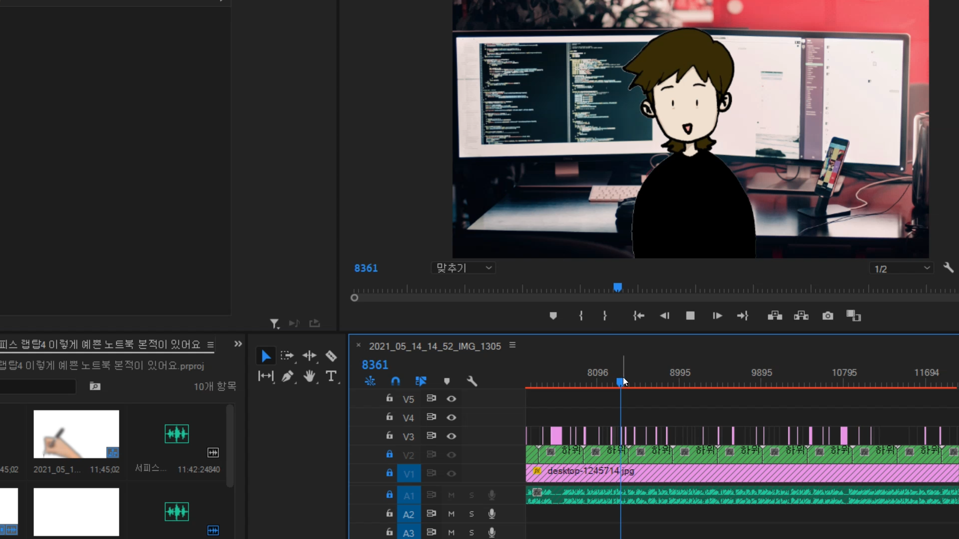 지금 프리미어 프로를 켰어요 프리미어 프로가 CPU를 많이 먹고 발열도 많이 발생되는 무거운 프로그램이에요 이렇게 영상편집을 할 때 서피스랩탑4와 갤럭시북 프로 360 동일하게 했어요