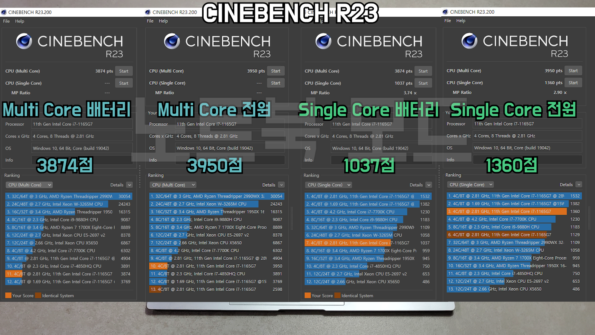 먼저 노트북 모드에서 성능을 보겠습니다 전원을 연결하지 않는 배터리 상태에서 향상된 배터리 옵션으로 멀티코어가 3874점이 나왔고요 이 상태에서 전원을 연결하고 최고 성능으로 하게 되면은 멀티코어가 3950점으로 증가하게 됩니다