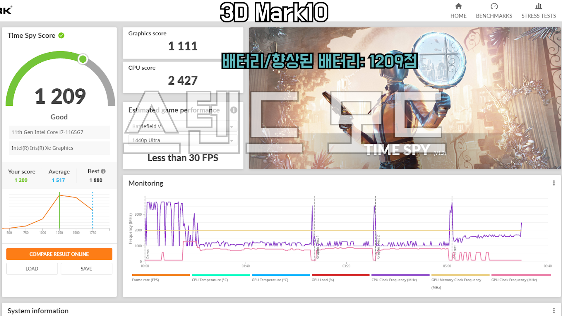 배터리 상태에서 향상된 배터리 모드로 했을 때 종합 점수는 1209점이 나왔습니다 그래픽 스코어는 1111점이 나왔고