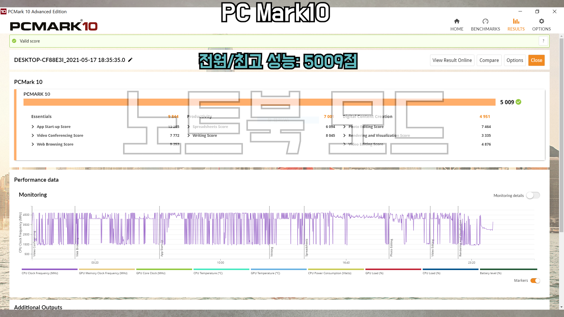 전원을 연결할 상태에서 최고 성능 모드일때 5009점이 나왔습니다