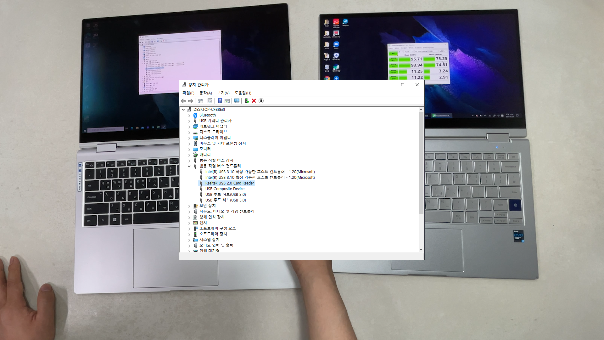 장치 관리자에서 보면 USB 2.0 카드 리더기를 지금 사용하고 있다고 나오고 있네요 이것 때문에 지금 속도 차이가 굉장히 크게 나는 거 같아요 4K 읽기 쓰기 속도를 갖고 있는 microSD 카드 꽂아도 2.0 속도 밖에 안 나오기 때문에 굉장히 불편할 거예요 그래서 리더기로 사용하는 건 추천 안 드리고 별도로 USB 방식에 러더기를 달고 copy를 해 주는 게 속도가 더 잘 나올 것 같네요