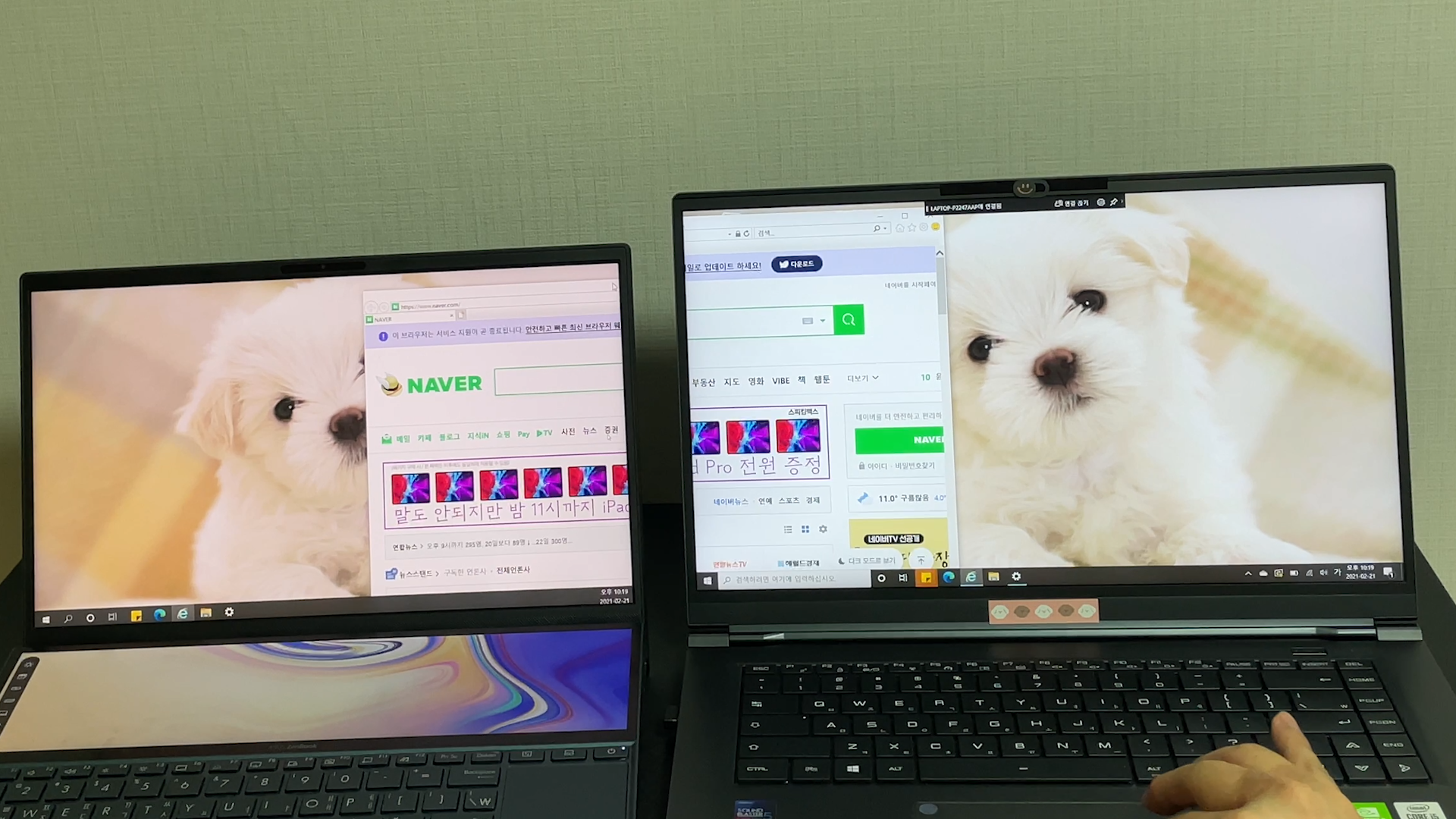 노트북 2대를 연결해 주면, 좌측이 보조 모니터로 사용되고, 우측이 주 모니터로 사용할 수 있게 됩니다.