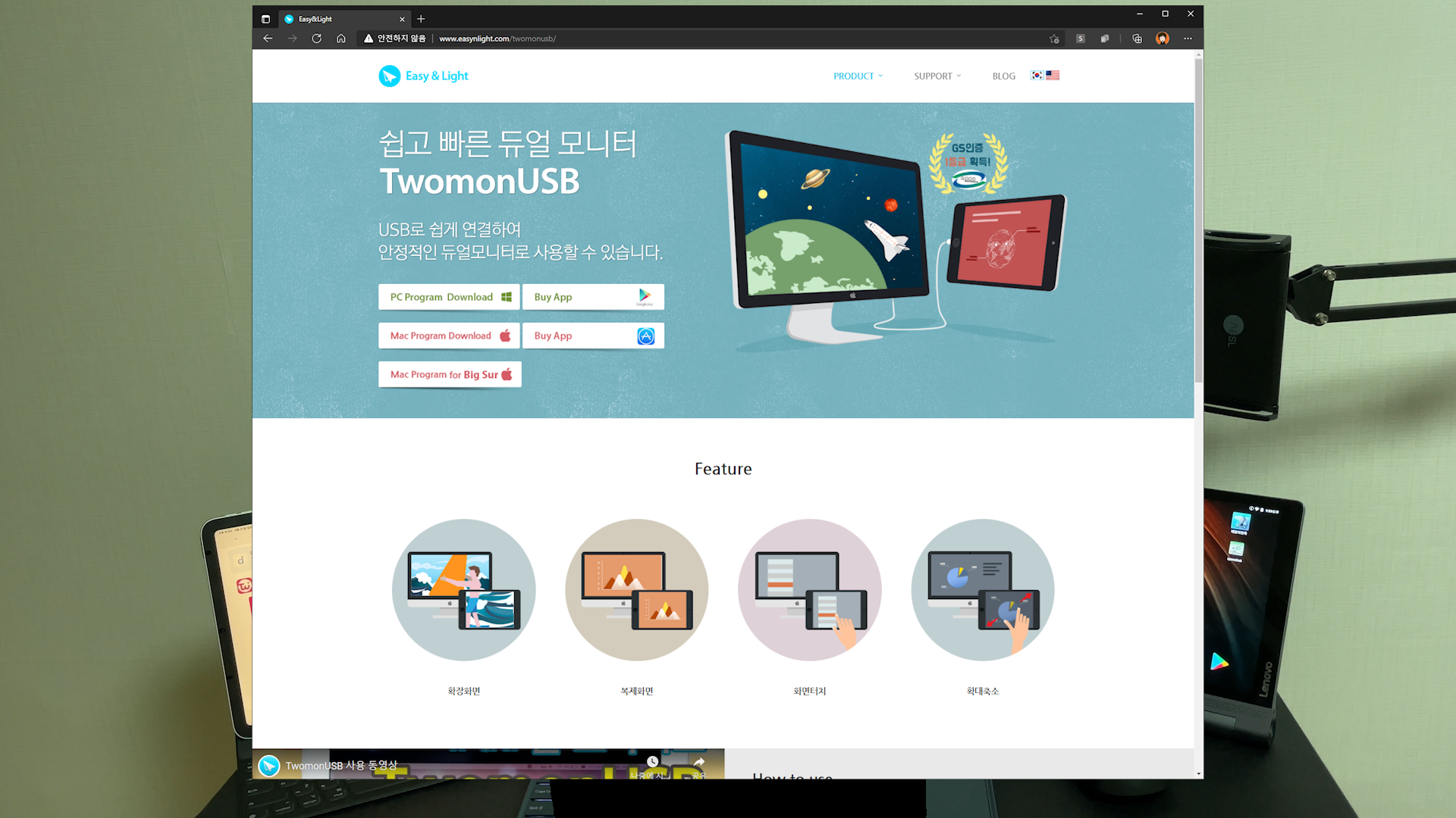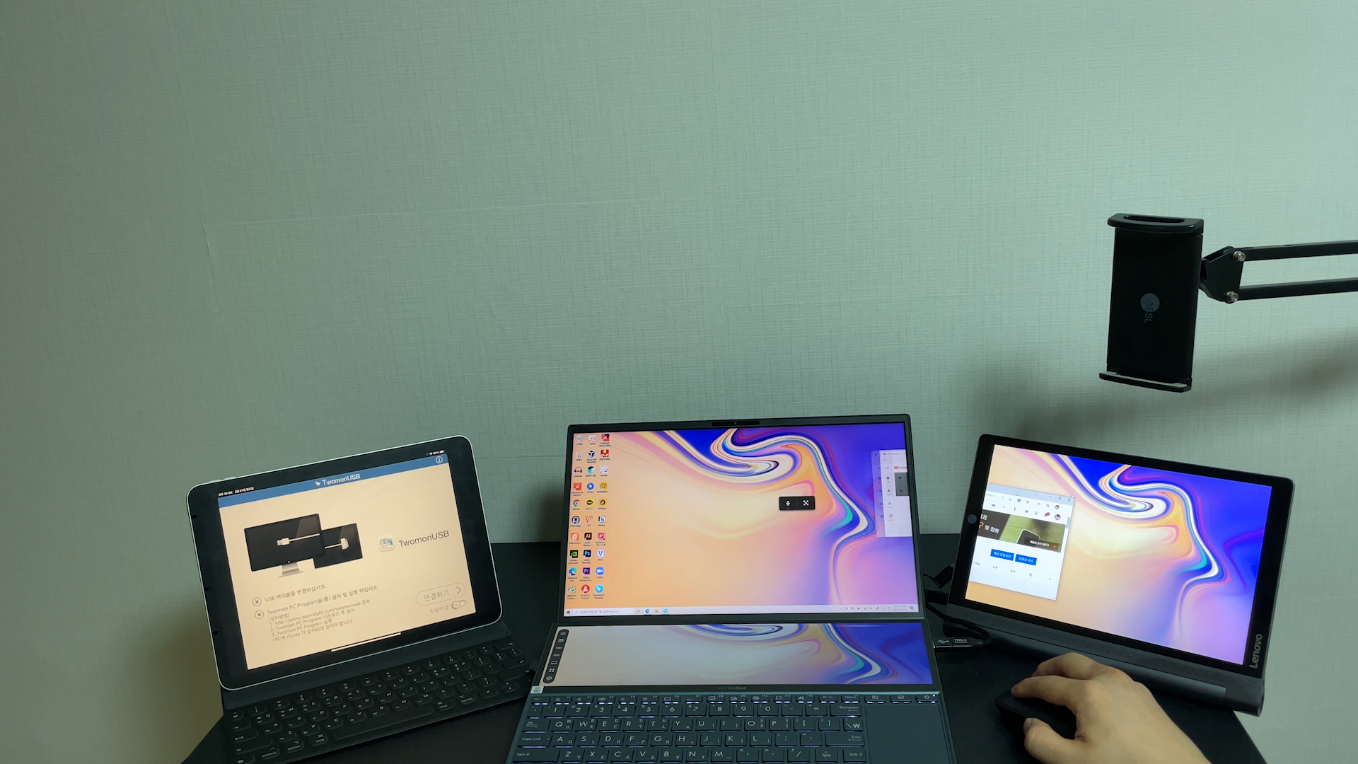 TwomonUSB 안드로이드 탭에 연결해 주면, 우측 레노버 태블릿 화면을 보조 모니터로 활용할 수 있습니다.