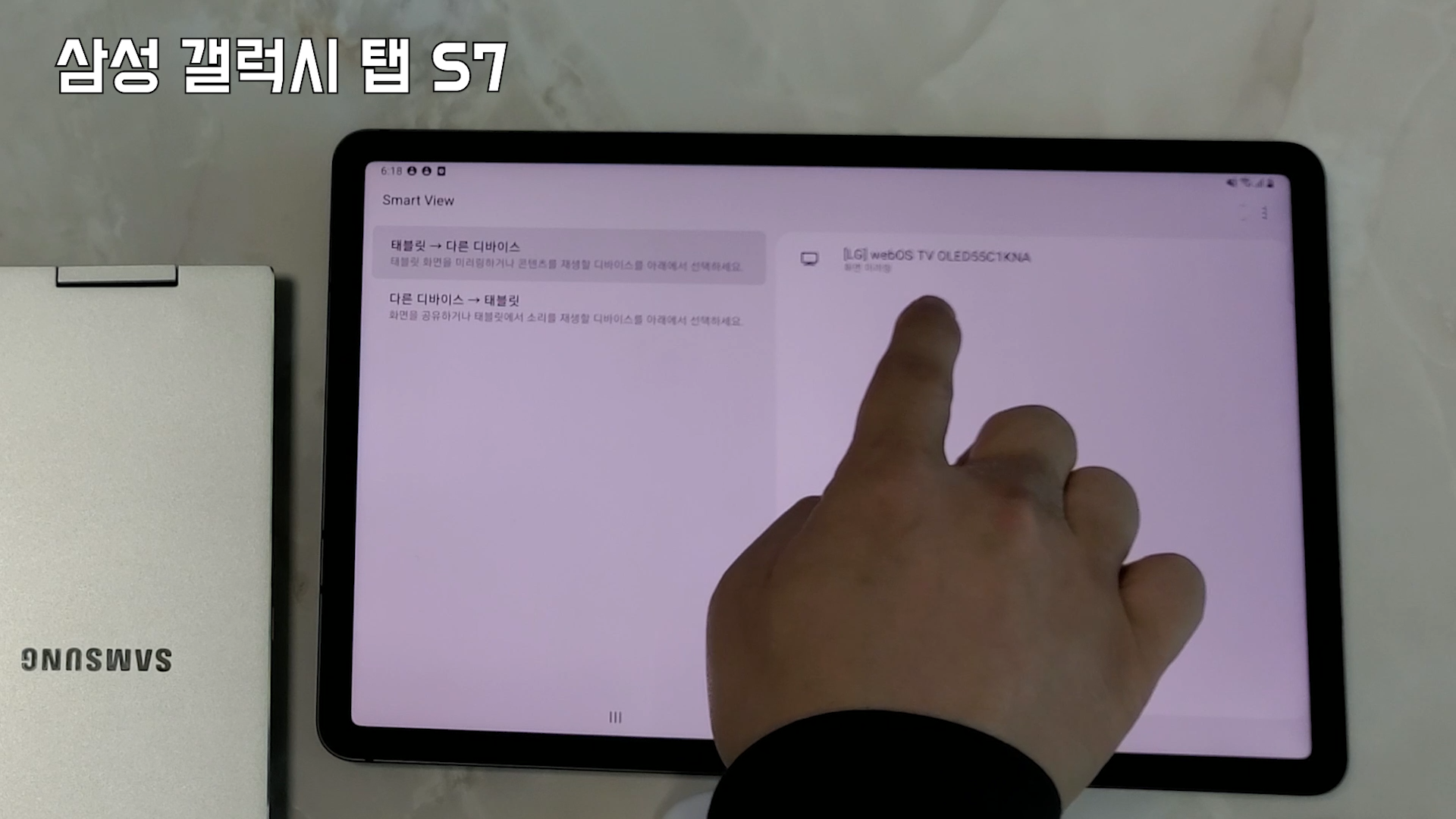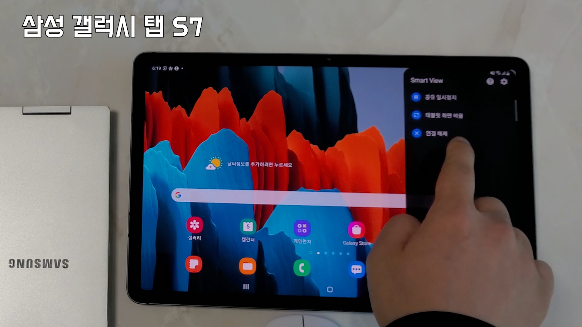 보시는건 갤럭시 Tab S7이고 전체화면 기능이 있습니다. 윗쪽을 쓸어 내려서 Smart View를 선택을 해요