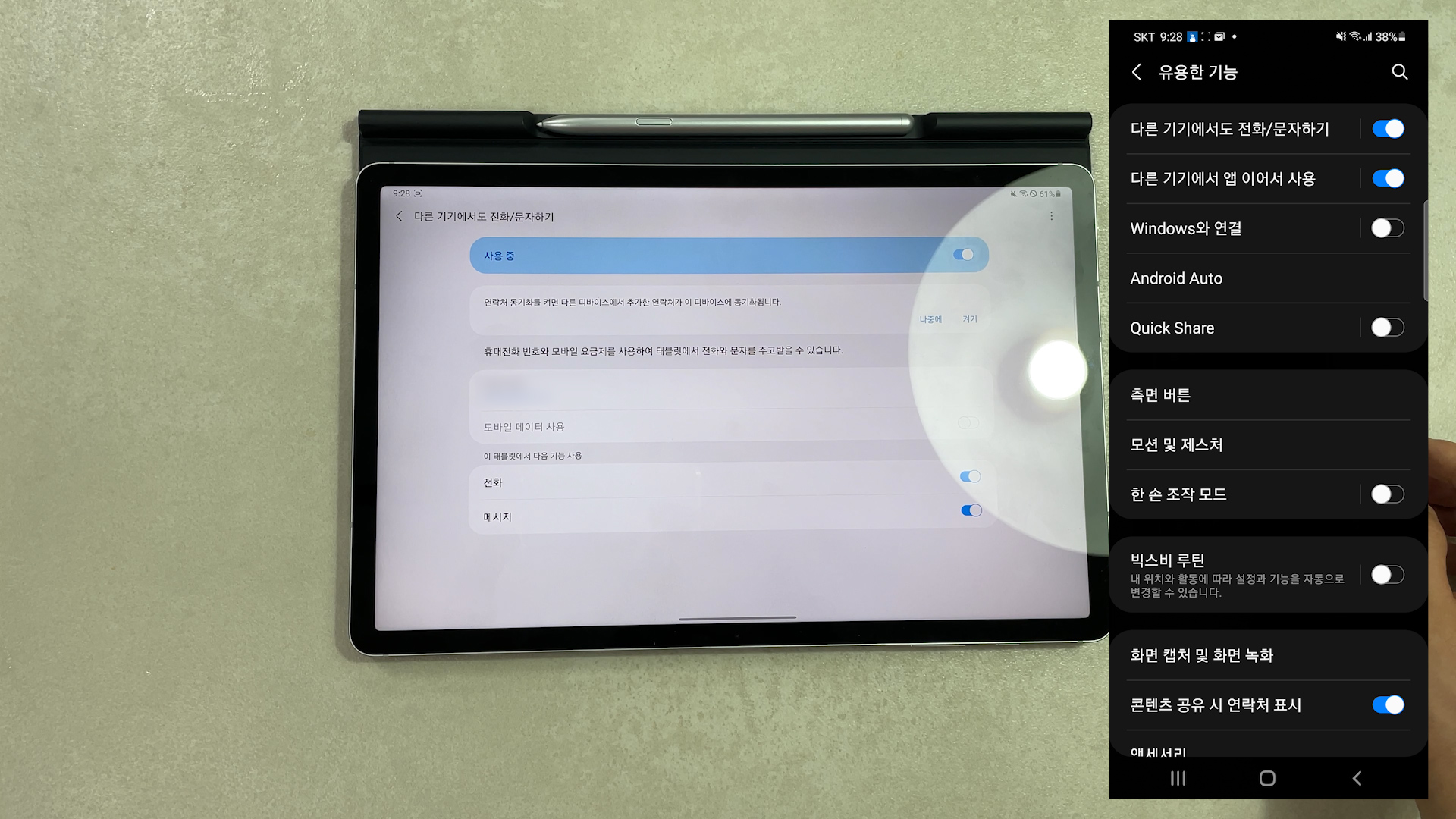설정 - 유용한 기능 - 다른 기기에도 전화/문자하기를 체크를 해 줘요