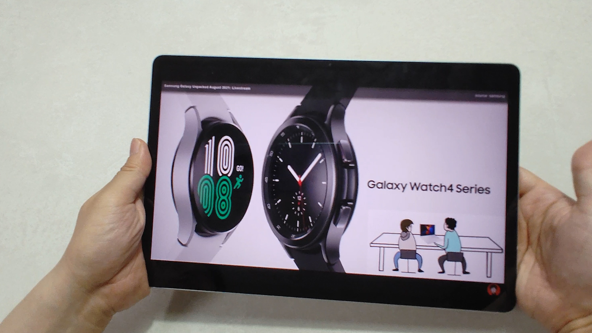 영상 시청은 화면이 크면 클수록 좋지요. 12.4인치 화면은 영상 시청하기에도 좋은 사이즈 입니다. 그리고 영상에 몰입하기 위해서는 사운드도 실감나면 좋겠지요? 갤럭시탭S7 FE는 2개의 스피커가 양쪽 위에 있어서 이렇게 양손을 감싸고 영상을 시청해도 스피커를 가리지 않아서 좋았습니다.
