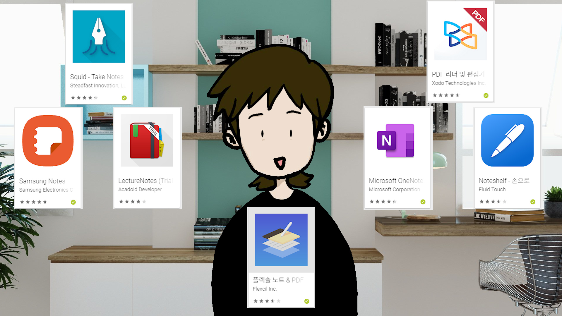 대표적인 노트앱은 삼성노트, 렉쳐노트, 스퀴드, 원노트, 노트쉘프, XODO, 플렉슬 등이 있습니다.