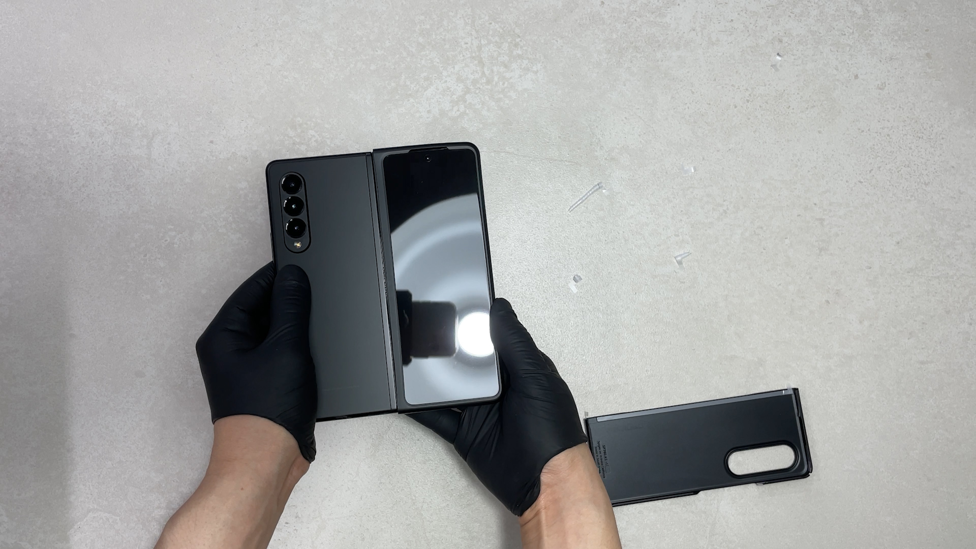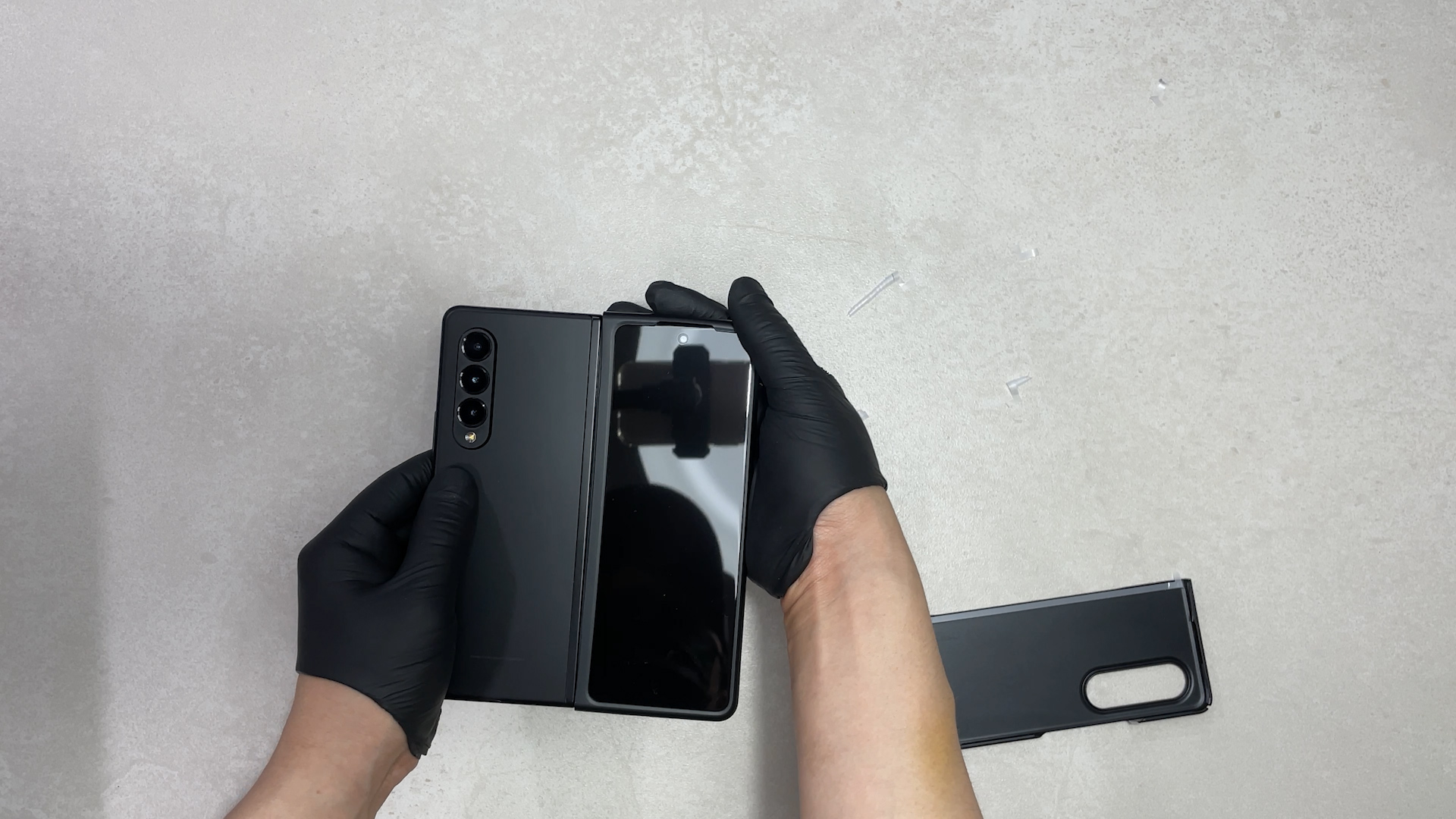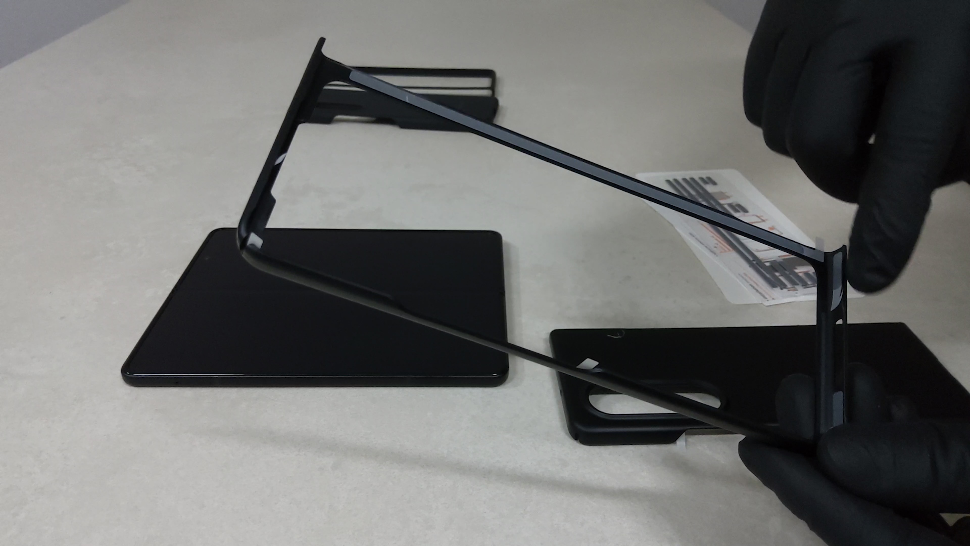 먼저 보호필름을 제거한 후 디바이스를 펼친 상태에서 가장자리부터 밀어 넣어 줍니다. 그리고 중앙 힌지 부분을 끼워주세요.