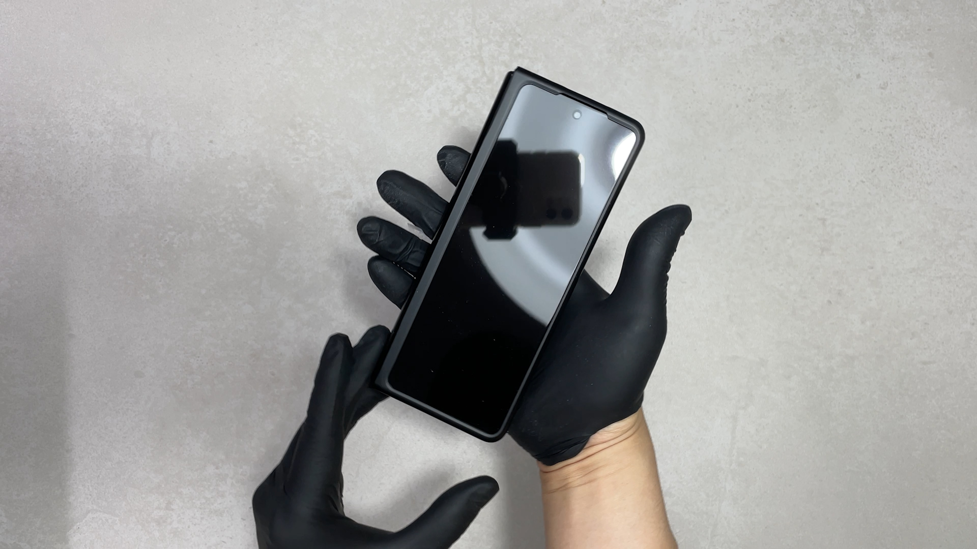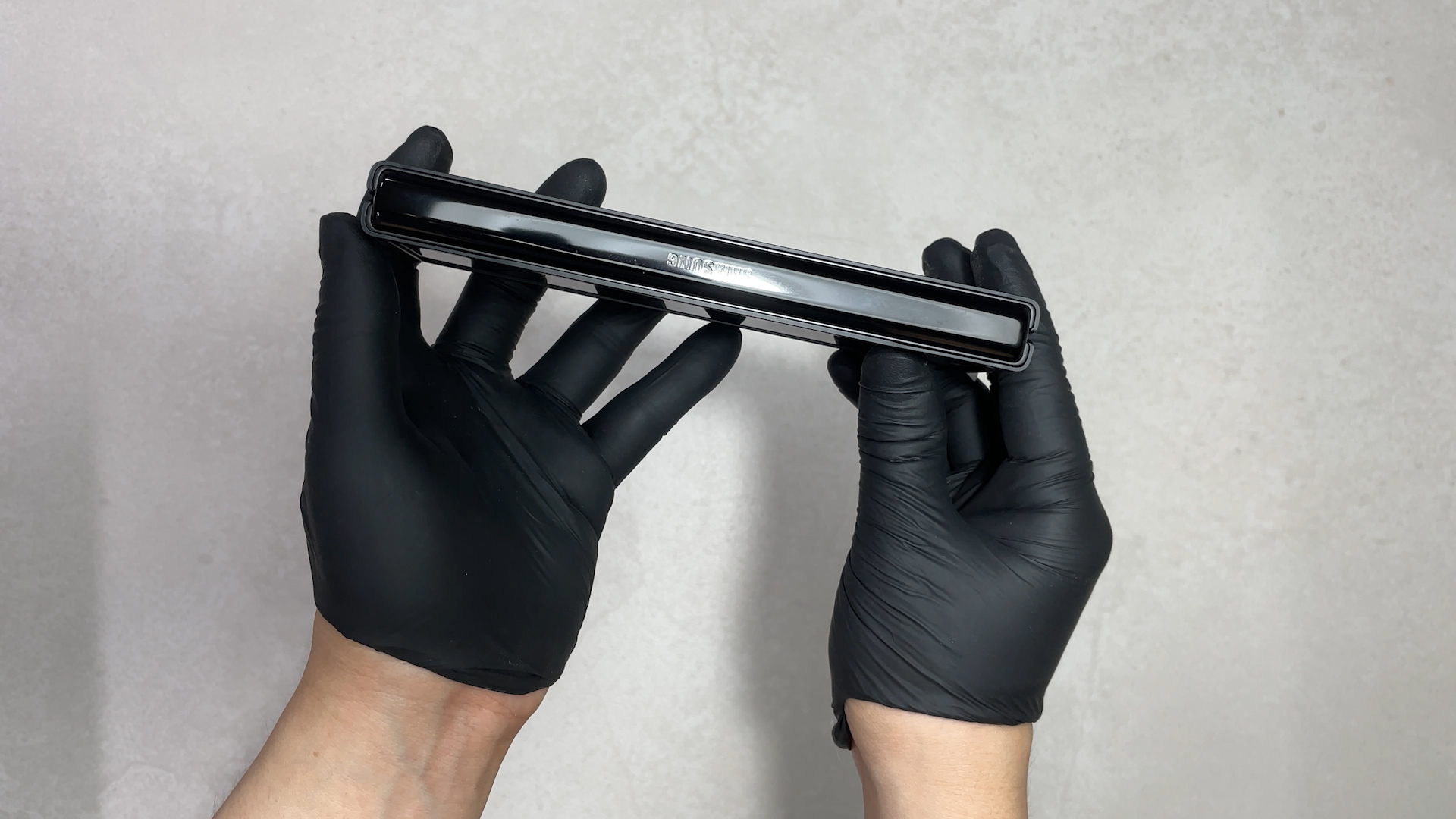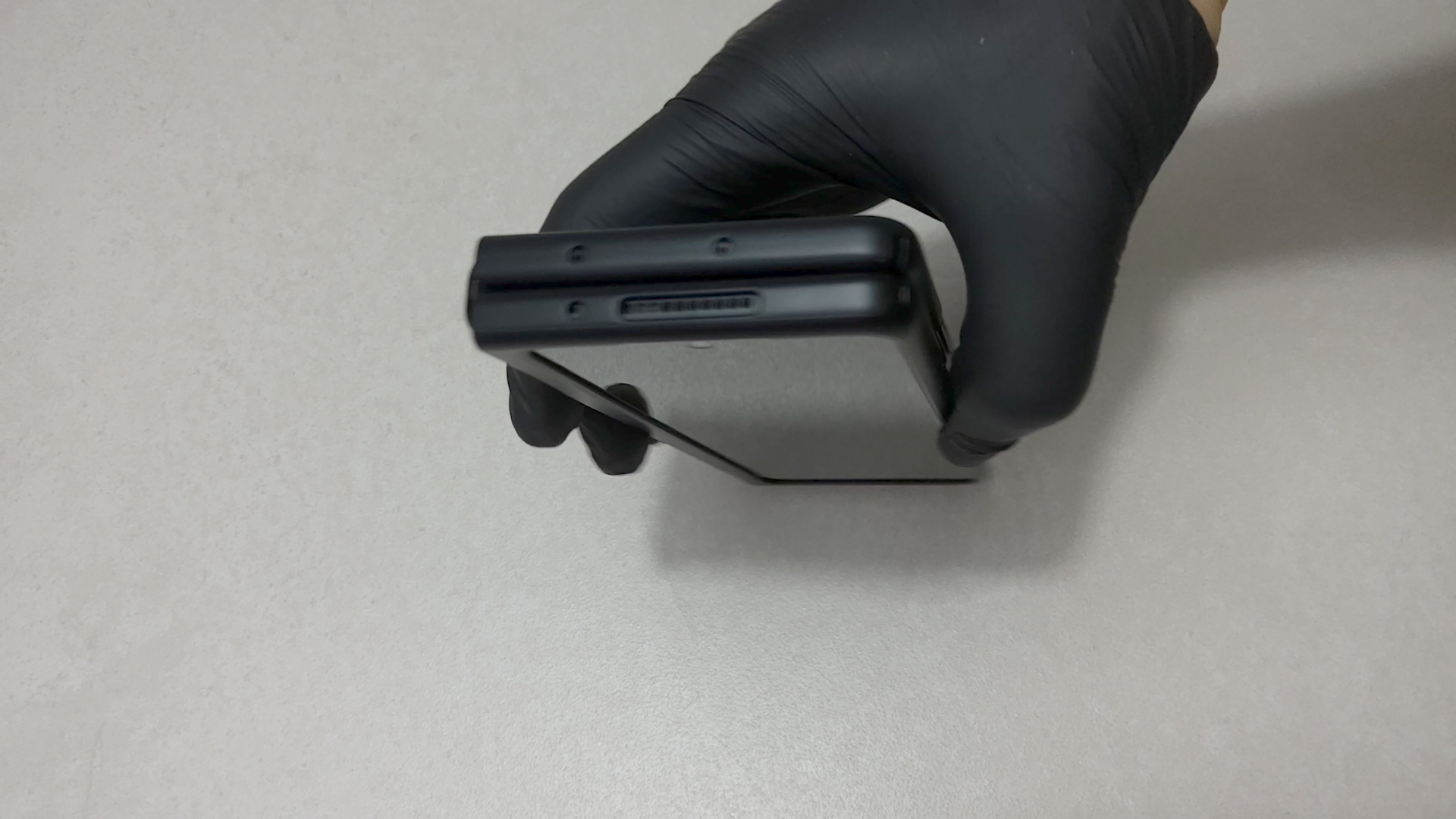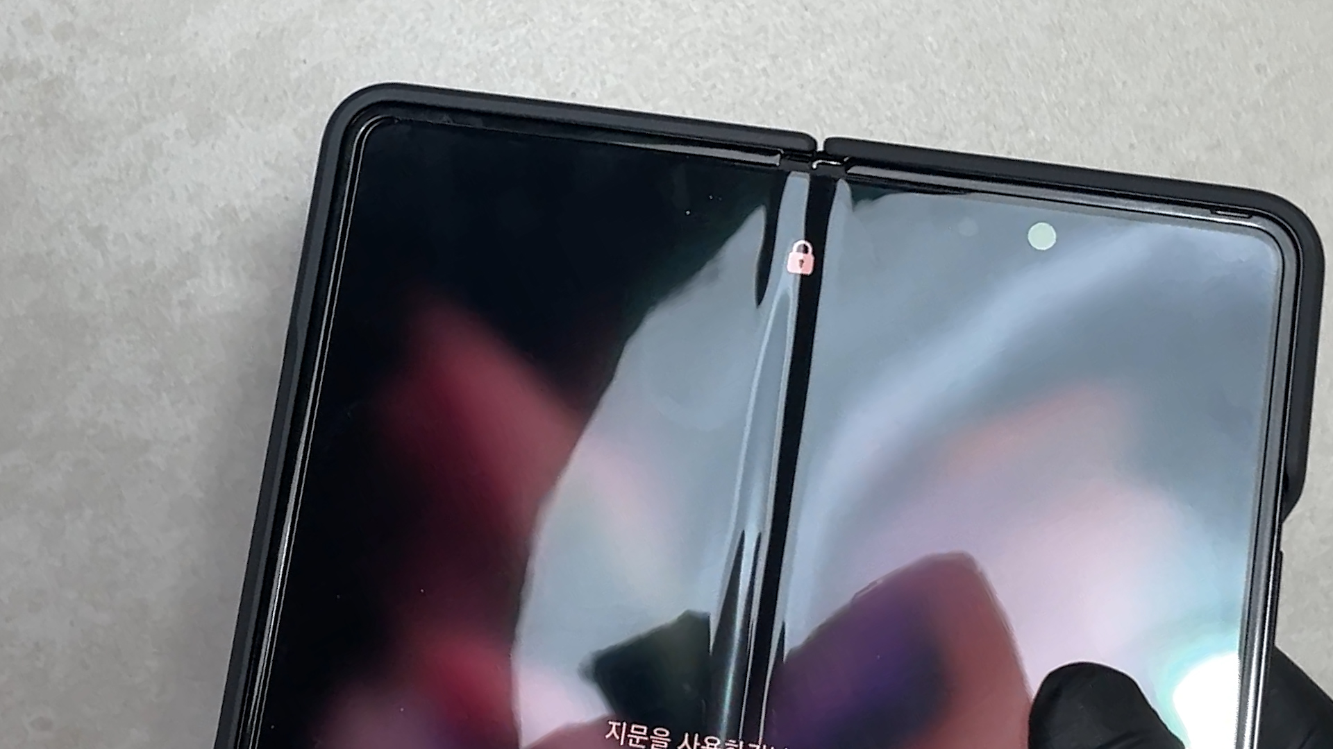 먼저 보호필름을 제거한 후 디바이스를 펼친 상태에서 가장자리부터 밀어 넣어 줍니다. 그리고 중앙 힌지 부분을 끼워주세요.
