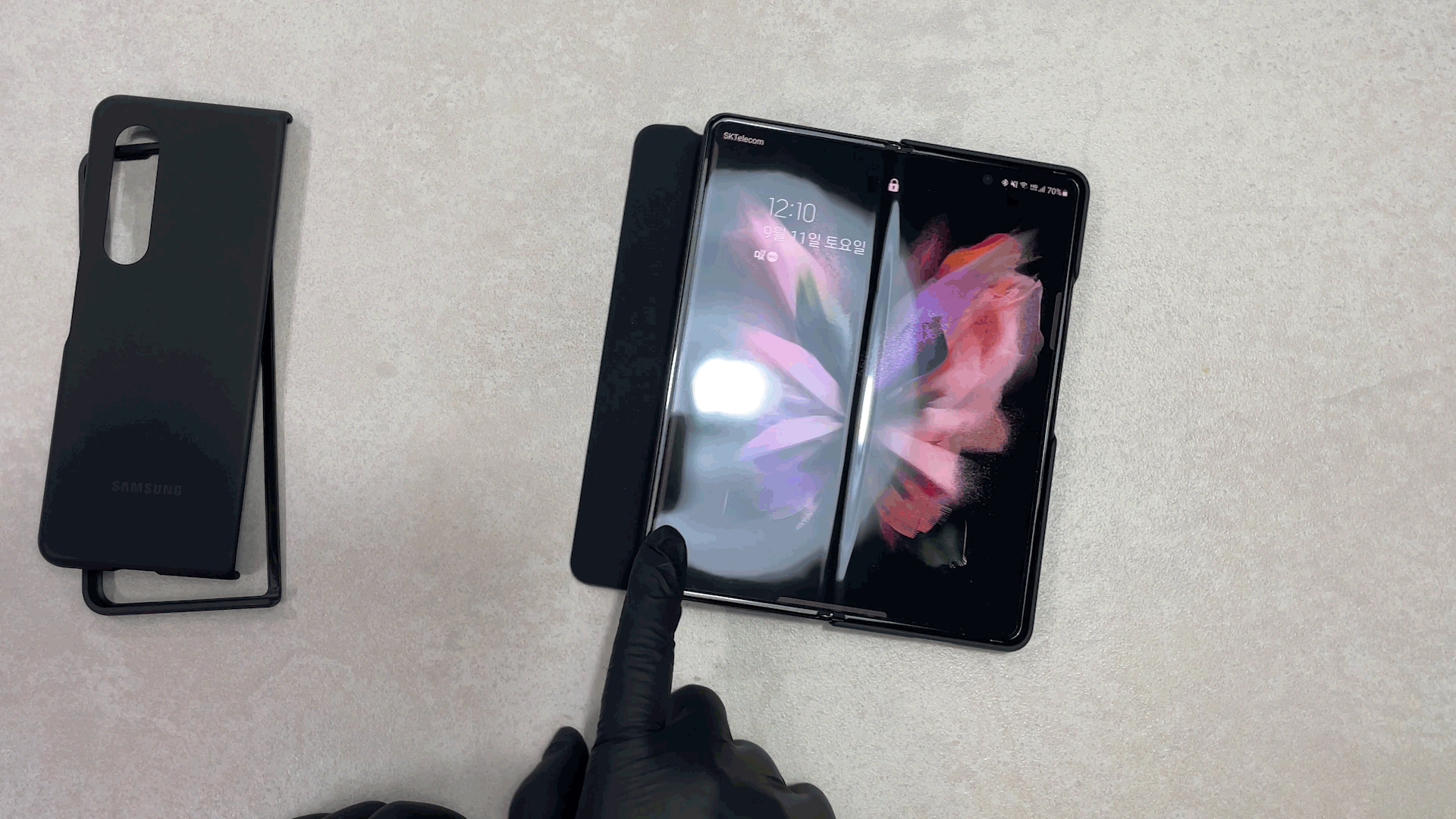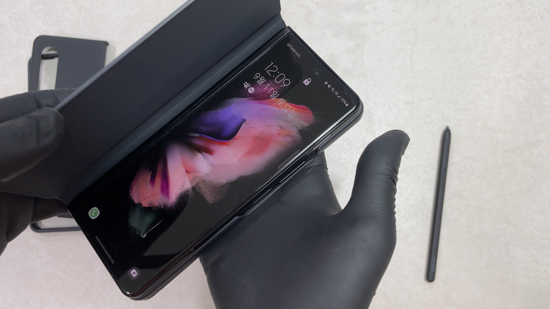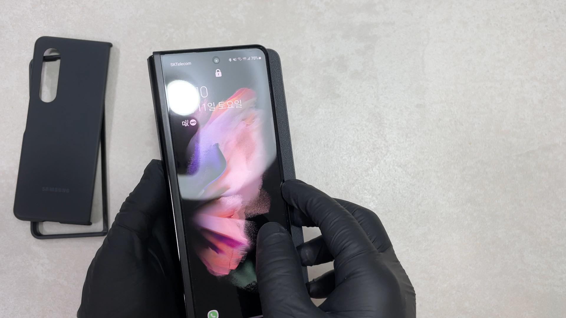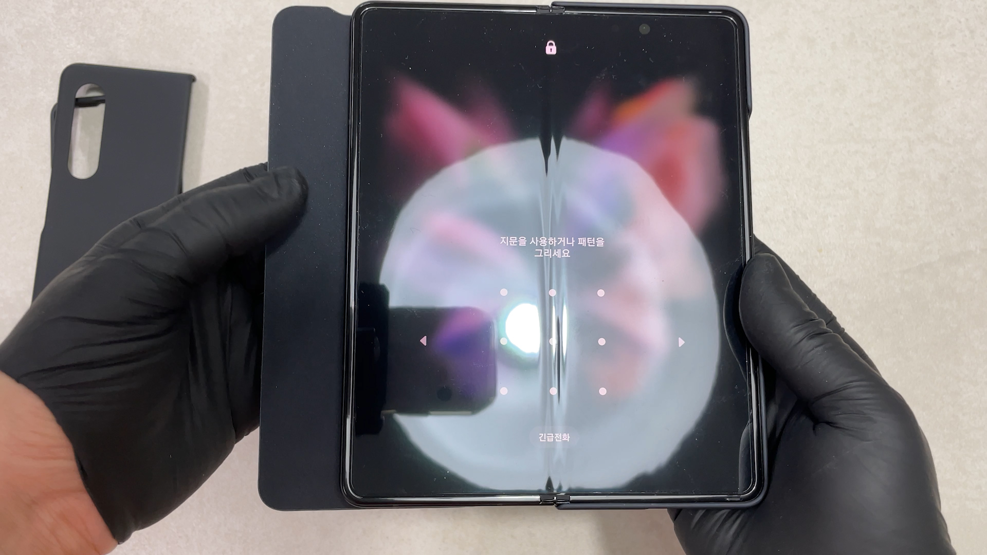 이 케이스를 갤럭시 폴드3에 착용한 상태예요 탈착을 위해서 홀이 있는데 이게 단점이고