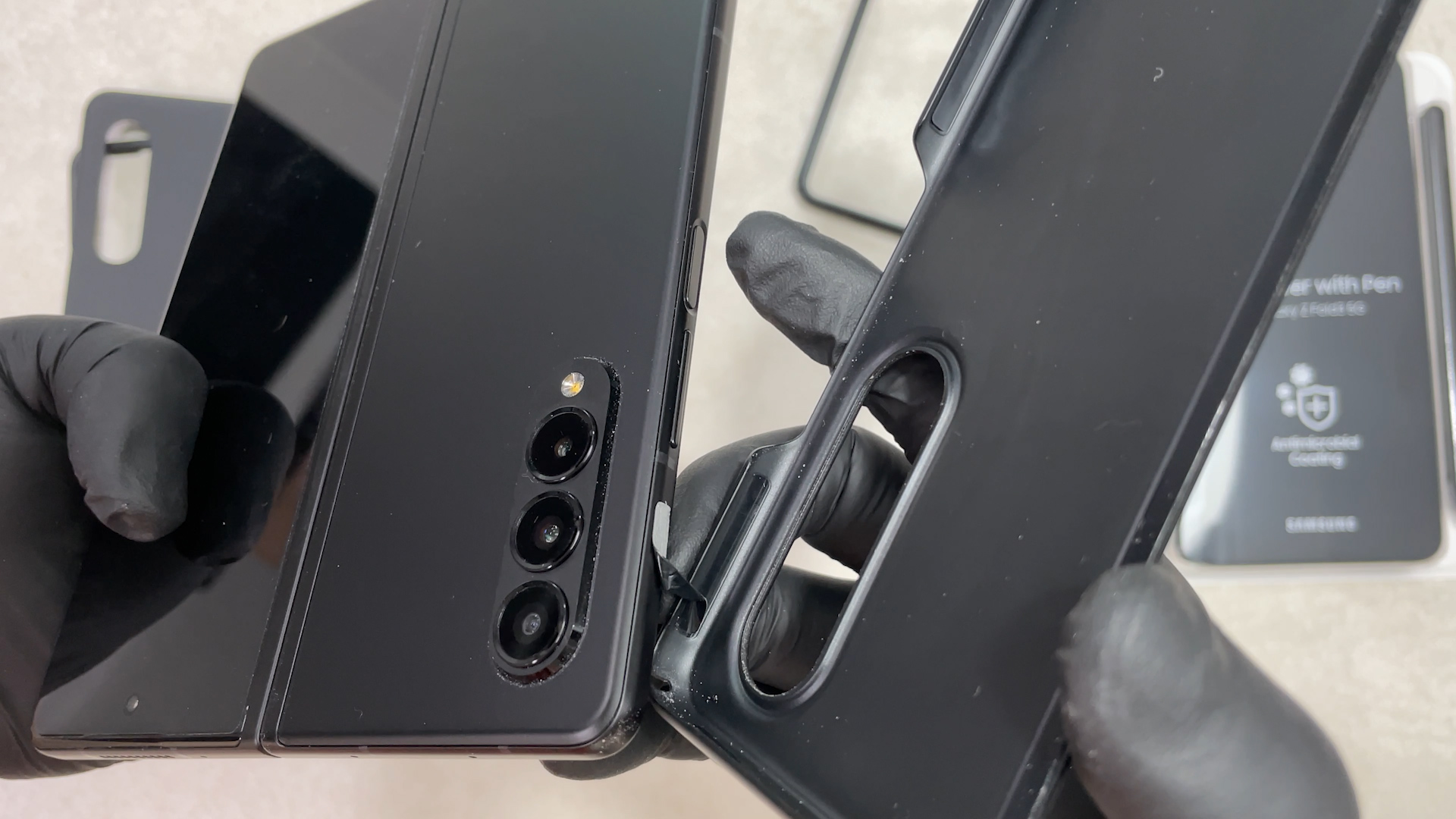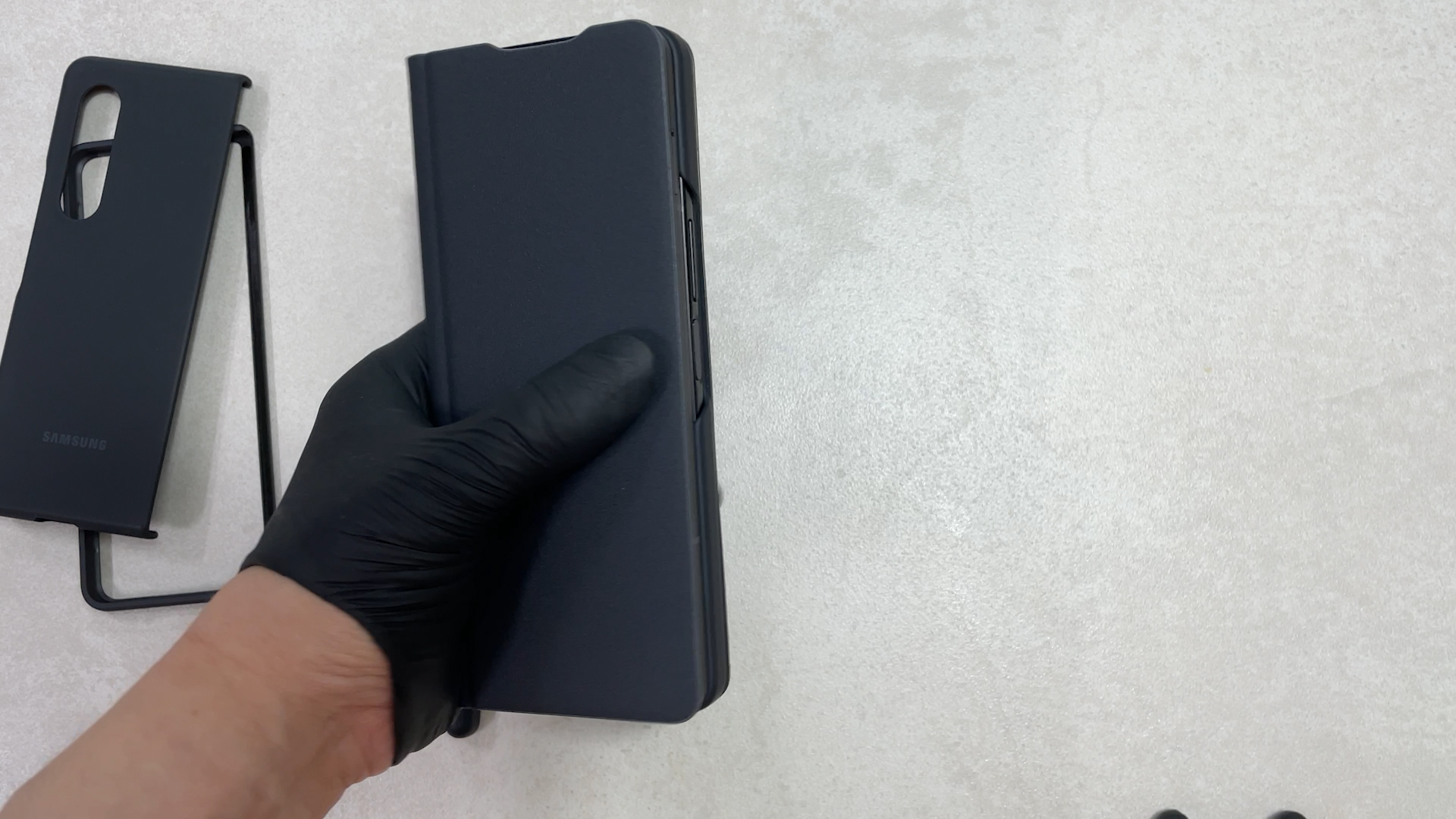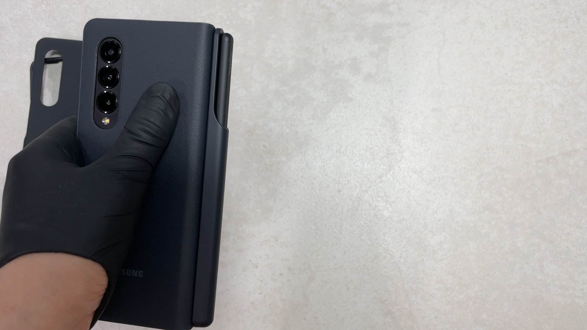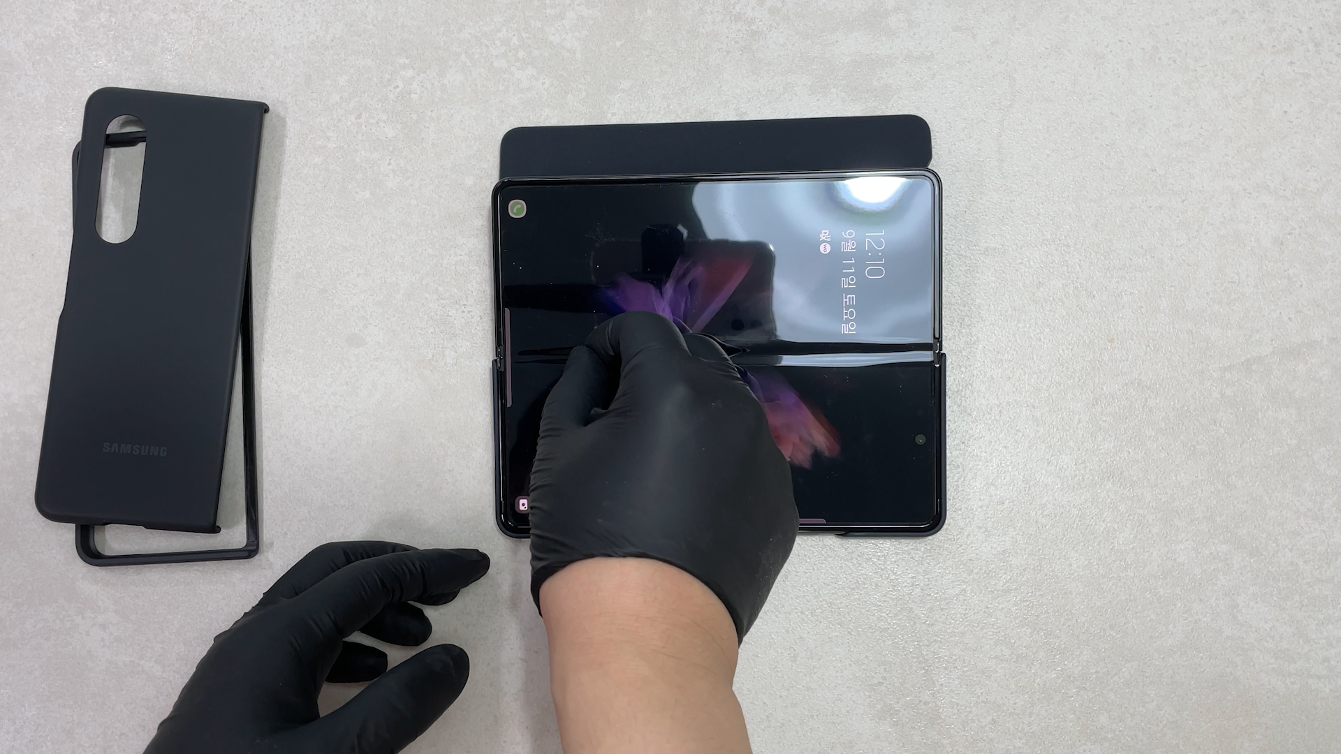 이 케이스를 갤럭시 폴드3에 착용한 상태예요 탈착을 위해서 홀이 있는데 이게 단점이고