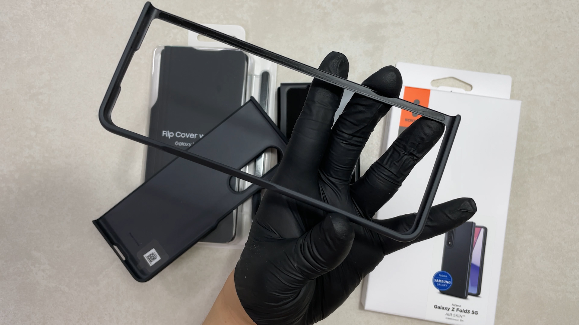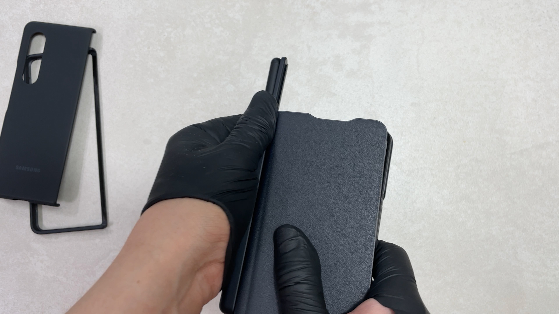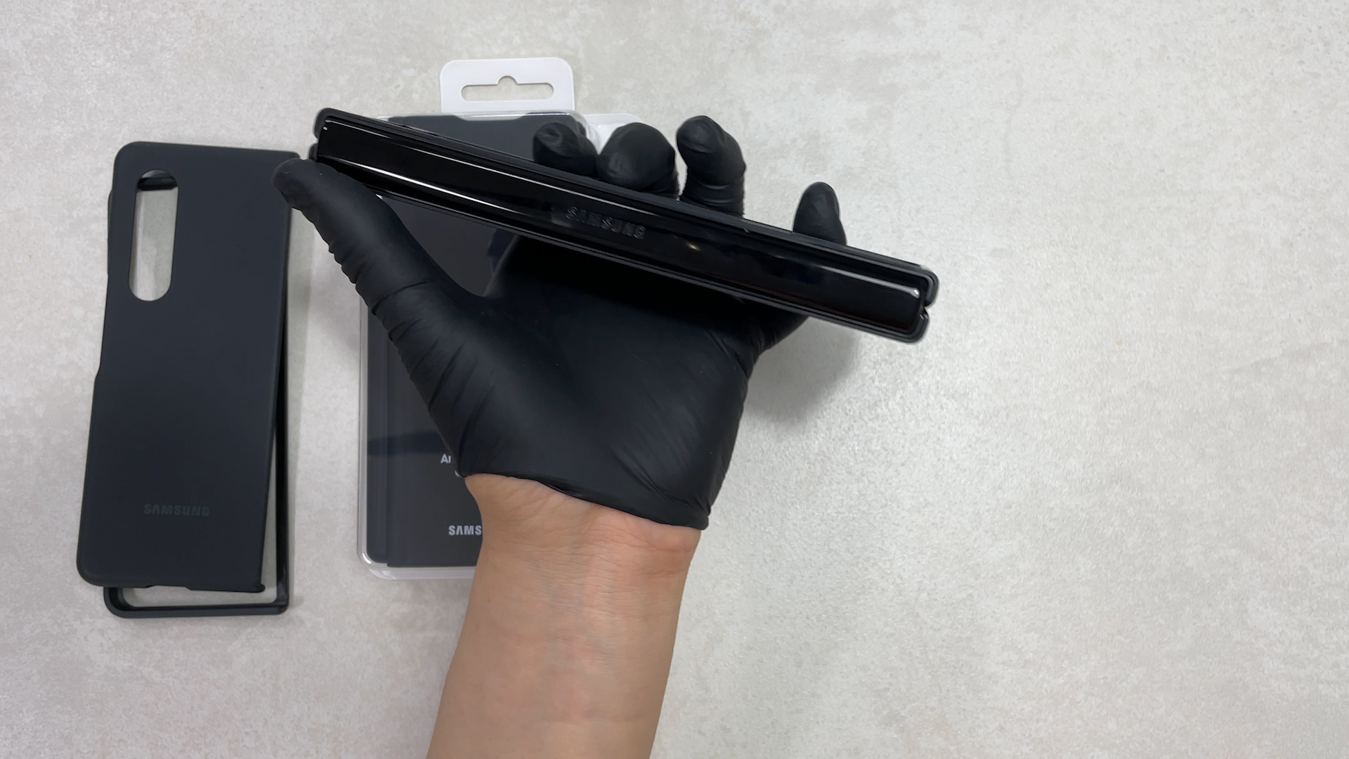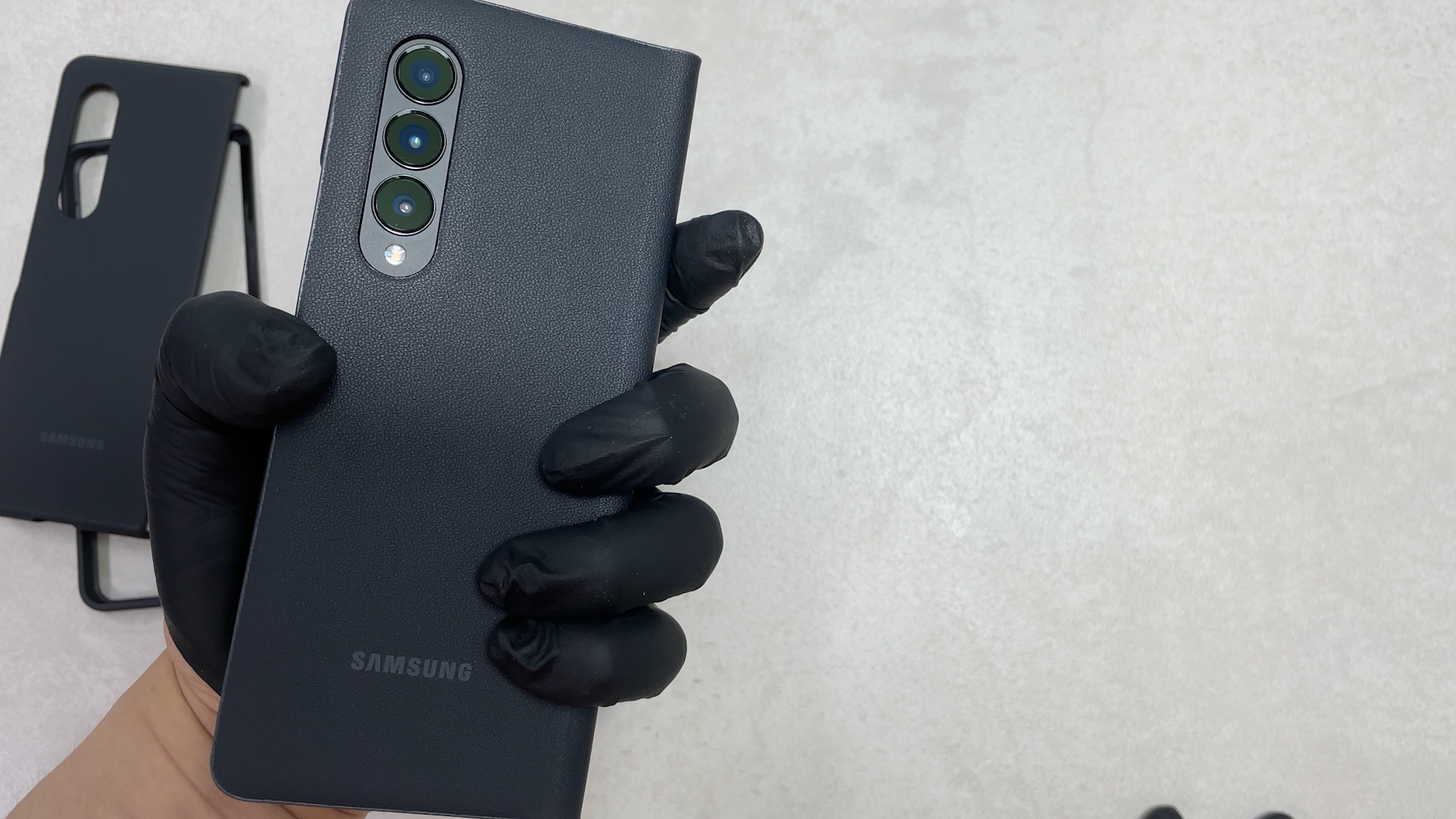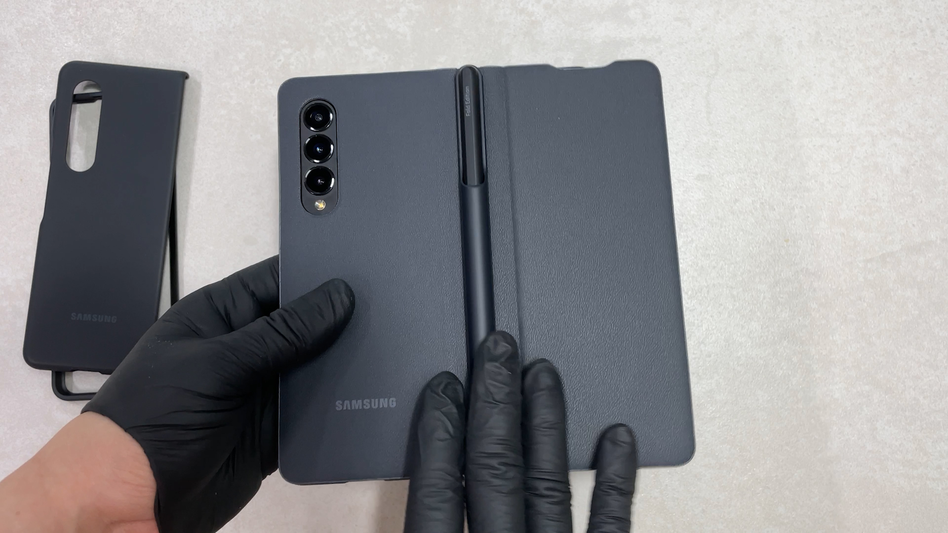 이 케이스를 갤럭시 폴드3에 착용한 상태예요 탈착을 위해서 홀이 있는데 이게 단점이고