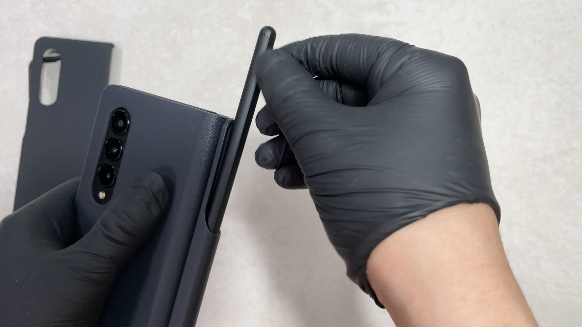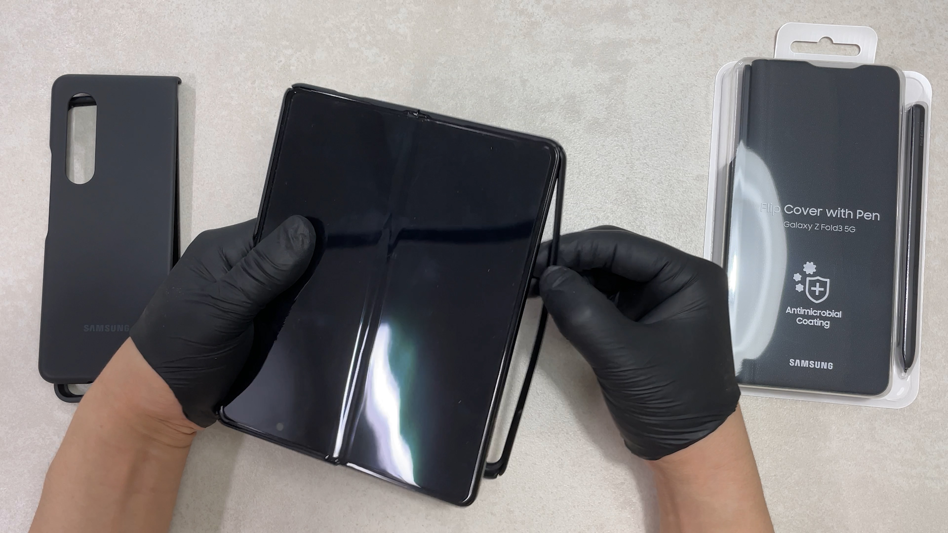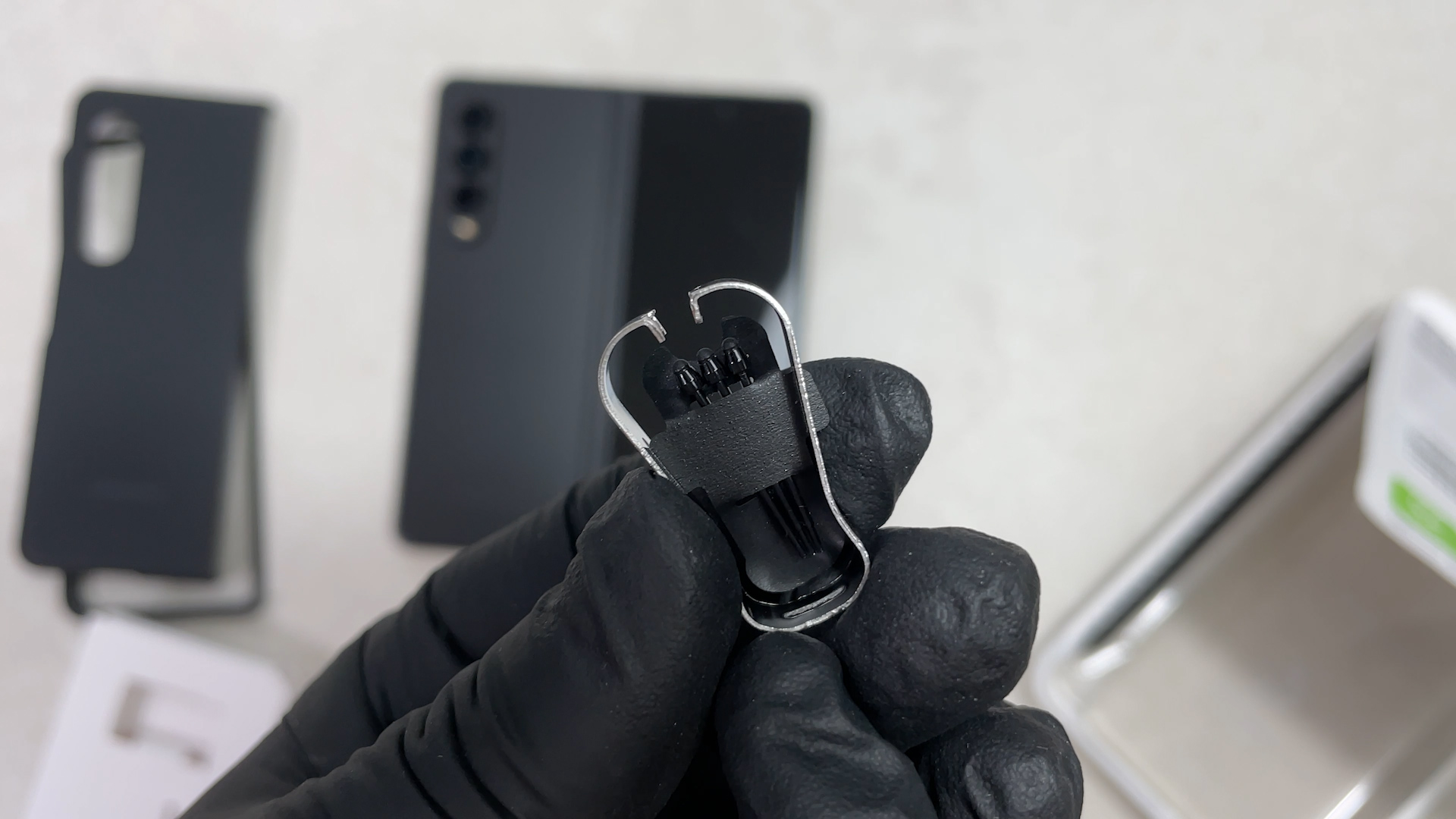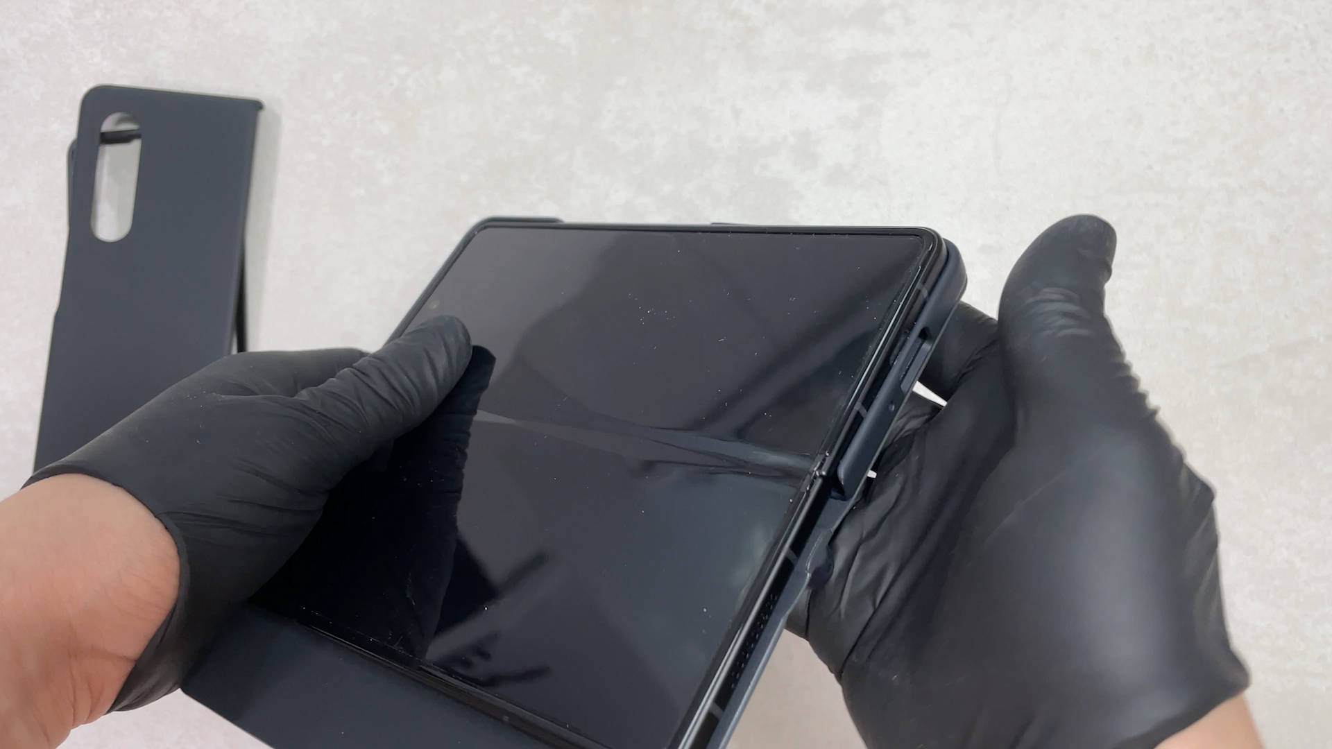 이 케이스를 갤럭시 폴드3에 착용한 상태예요 탈착을 위해서 홀이 있는데 이게 단점이고