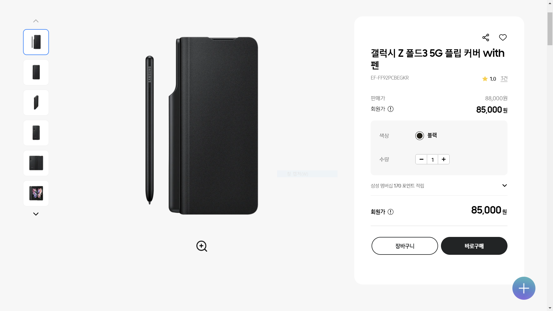 현재 기준으로 공식 홈페이지에서 갤럭시 폴드3 플립 커버 with 펜 가격은 85,000원입니다