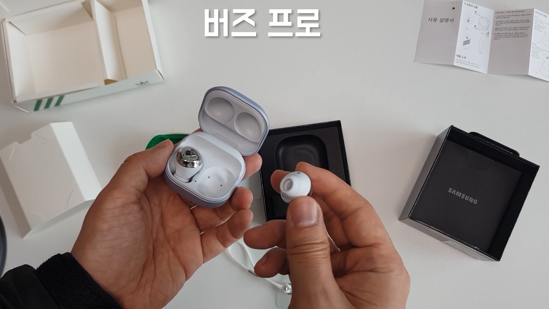 상품 받은 버즈2는 색상 선택은 안 되고 오직 흰색만 가능하다고 하는데요 저는 이전 영상에서 언급했지만 삼성디지털프라자에서 직접 방문해서 착용한 다음에 화이트로 마음을 정했기 때문에 오히려 좋았습니다.
