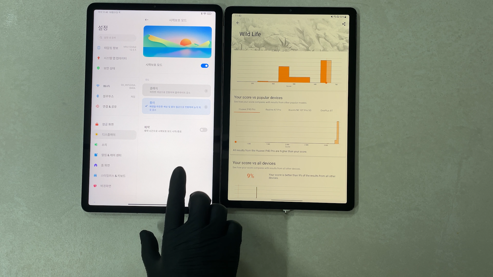 그 다음에 미패드5 장점이 여기서 끝나는 게 아니고 설정 가서 시력 보호 모드라고 있어요 얘를 켜면 책을 보는 느낌처럼 만들 수가 있어요 물론 갤럭시 탭 S5e도 시력 보호 모드가 있어요 "편안하게 화면 보기" 똑같이 이렇게 볼 수 있는데