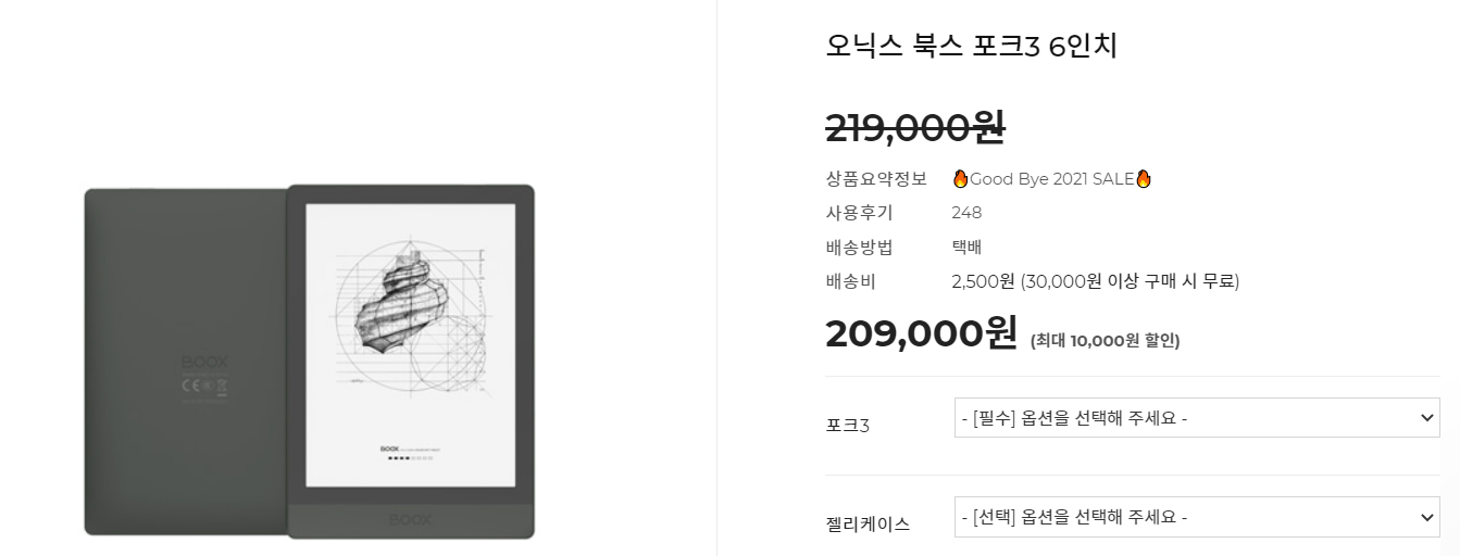 onyx poke3 + YES24 북클럽 3개월 이용권으로 215,000원입니다.