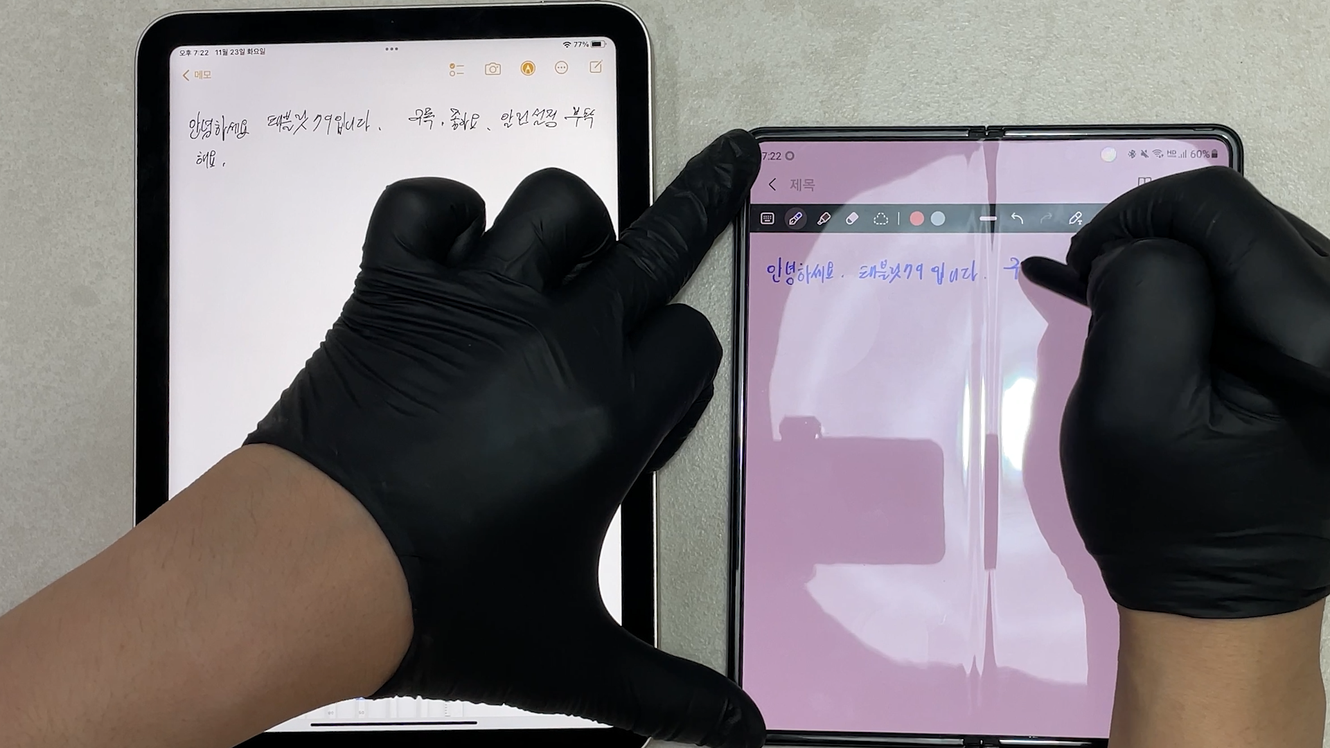 저는 글씨를 흘려 쓰는 스타일이라서 z폴드3 필기감을 더 선호합니다.