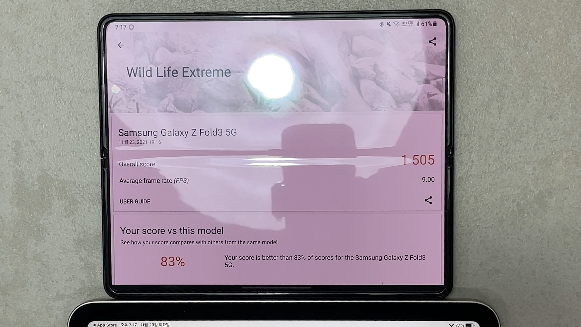 z폴드3의 스코어는 1505점이 나왔습니다.