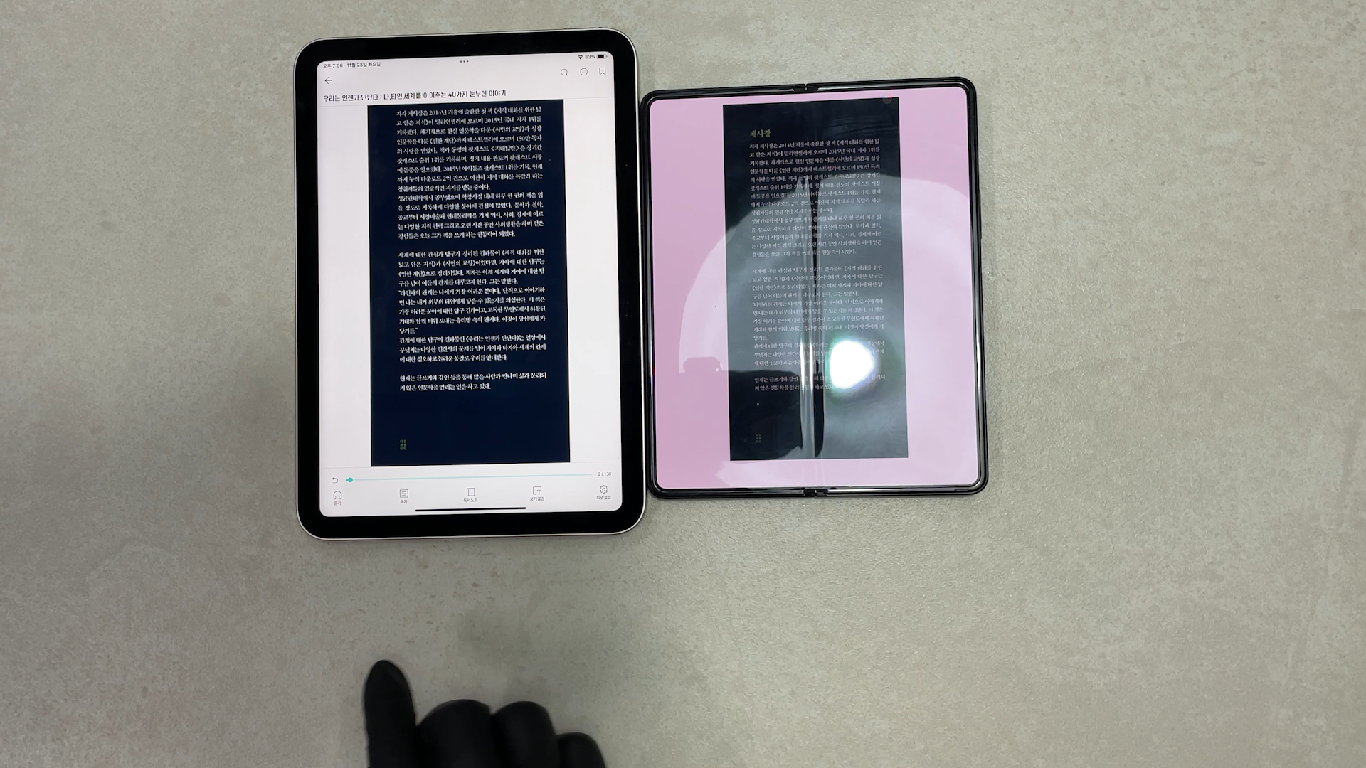 z폴드3는 아몰레드 특유의 플리커링이 있어서 e-Book 용도로 보면 아쉬움이 있습니다.