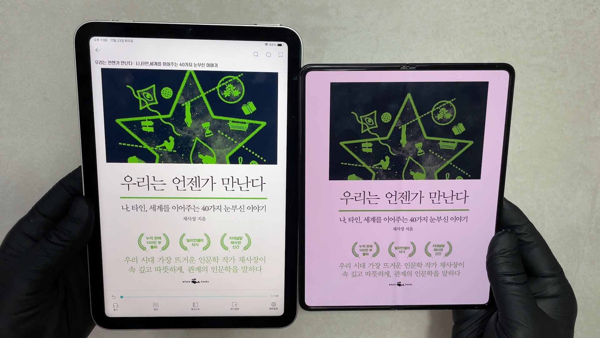 두 제품 모두 사이즈와 비율이 조금씩 다르지만 한손으로 책을 보는 데는 큰 문제가 되지 않습니다.