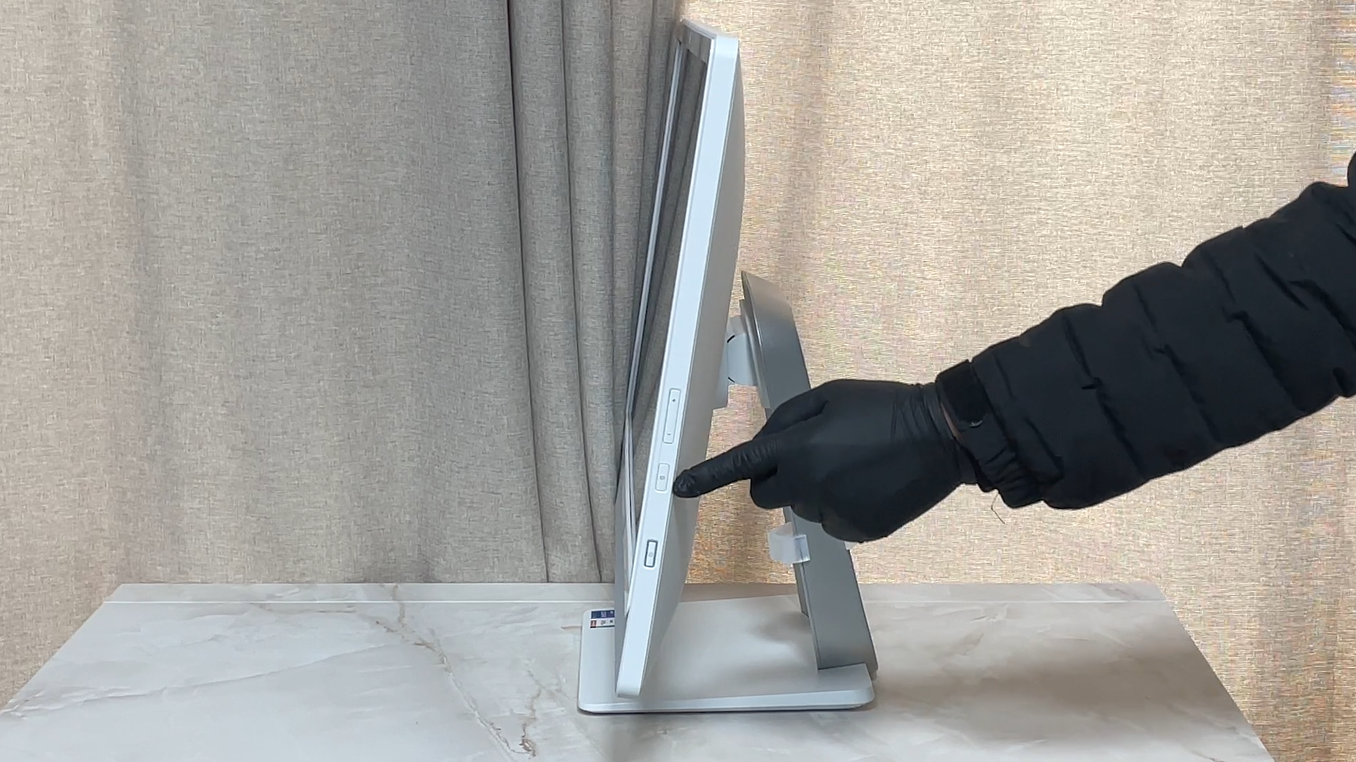 우측은 위에서부터 소리 조절 버튼, PC 모드와 모니터 모드 선택 버튼, 하단에는 전원 버튼이 있습니다.