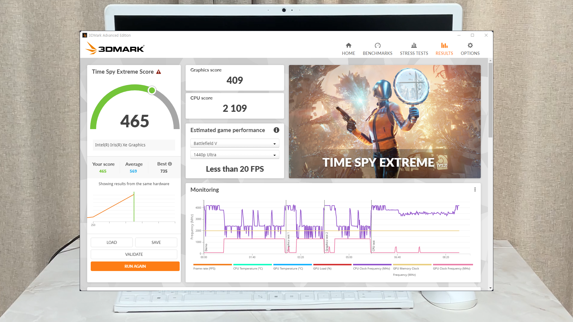 3DMark 스코어 465점이 나왔습니다.