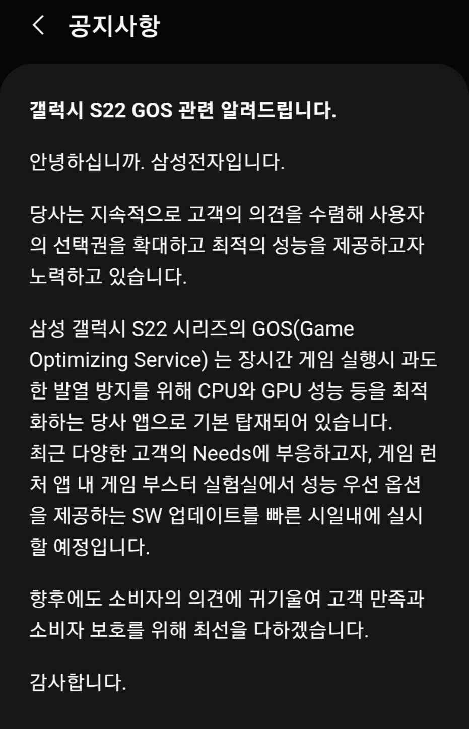 그래서 저는 GOS 앱 문제가 크게 체감이 되진 않았고, GOS 문제가 올해 처음 언급된 것도 아니고 2016년 갤럭시 S7부터 탑재된 앱이라서, 스마트폰으로 게임을 하는 분들은 예전부터 불만을 이야기 했었습니다.