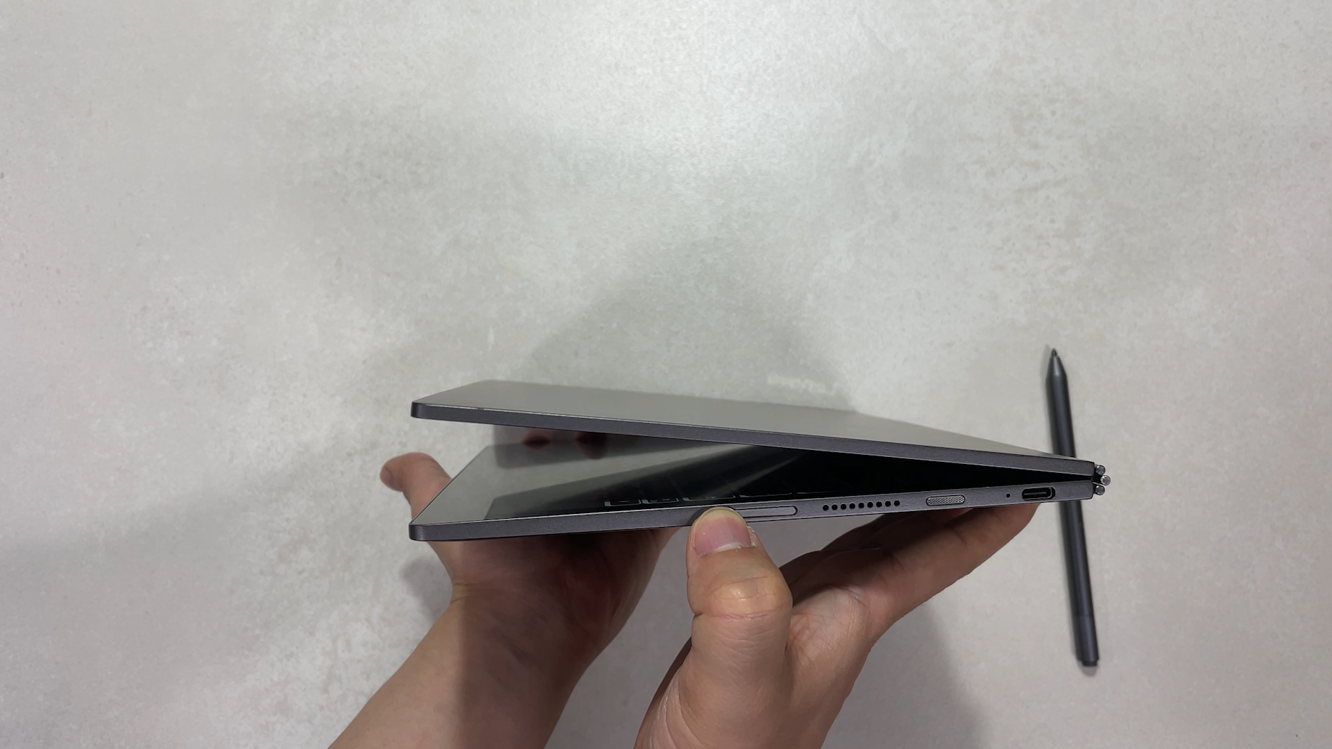 오른쪽을 보면 USB-C타입 포트, 전원 키, 스피커홀, 볼륨 업/다운키가 있습니다.