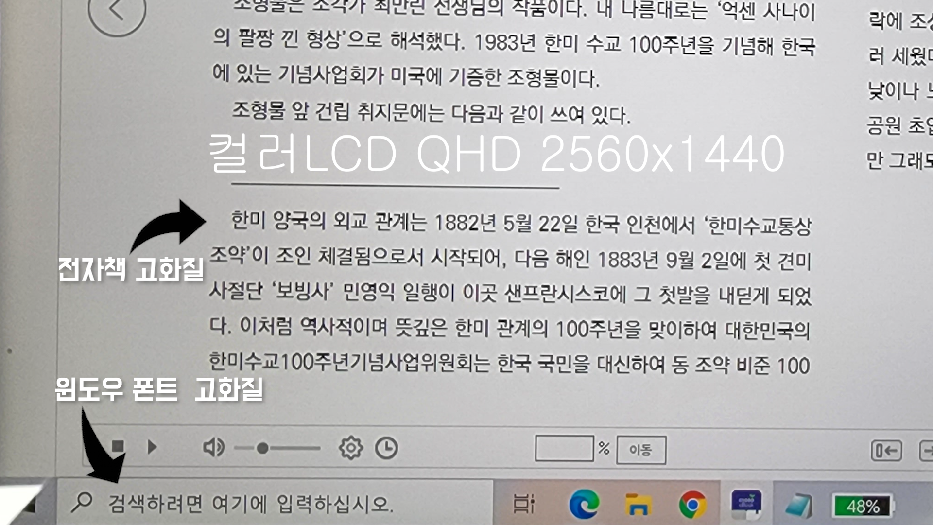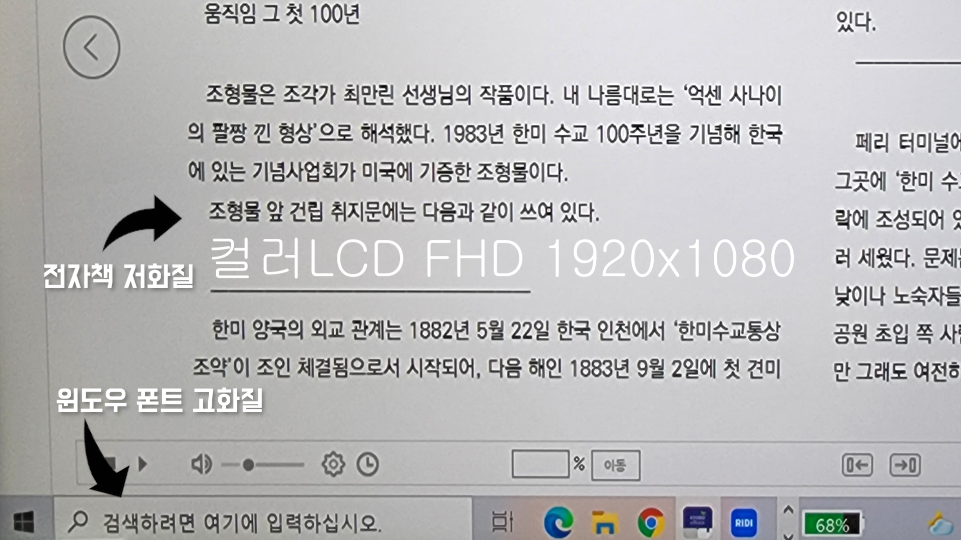 컬러LCD는 QHD 2560x1440 스크린인데 e-ink는 FHD 1920x1080를 사용합니다. 그래서 미러링 할때 자동으로 컬러LCD도 FHD 1920x1080으로 해상도가 자동으로 전환이 됩니다. 이때 국내 전자책 프로그램들이 DPI Scaling 대응이 원활하지 않는건지 모르지만 가독성이 현저하게 떨어지게 됩니다.