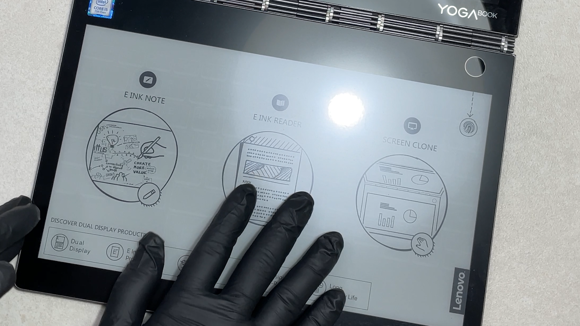 안쪽을 열면 하단 키보드 부분이 e-ink 디스플레이를 사용하고 있어서 듀얼 액정을 가지고 있는 제품입니다.