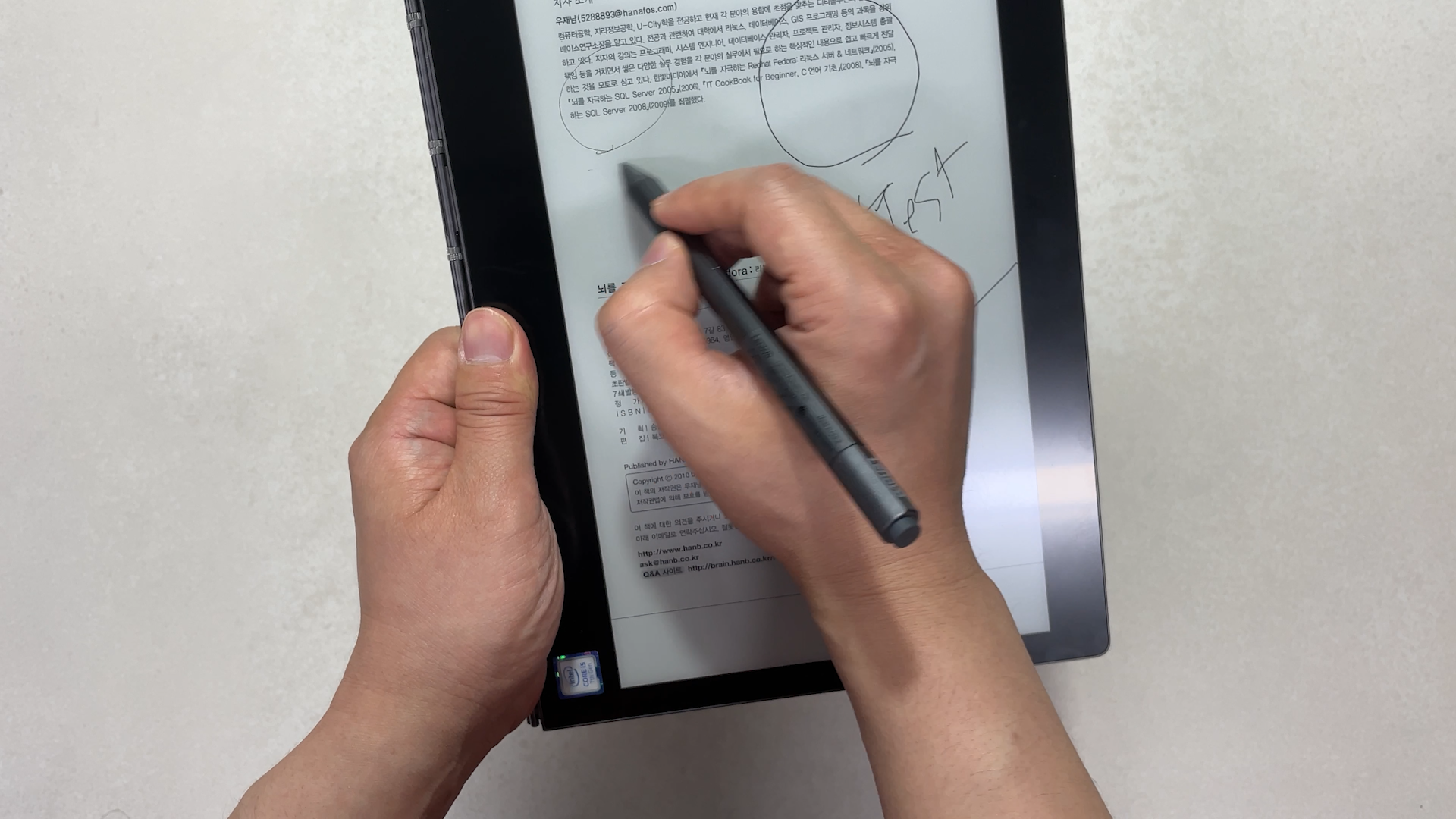 2018년도에 나왔을 때는 e-ink 화면에 스타일러스펜은 노트 필기에서만 사용할 수 있었습니다. PDF 문서는 필기가 안돼서 불만이 많았는데요. 이 부분은 2019년에 업데이트돼서 PDF 문서에도 필기가 가능해졌습니다.