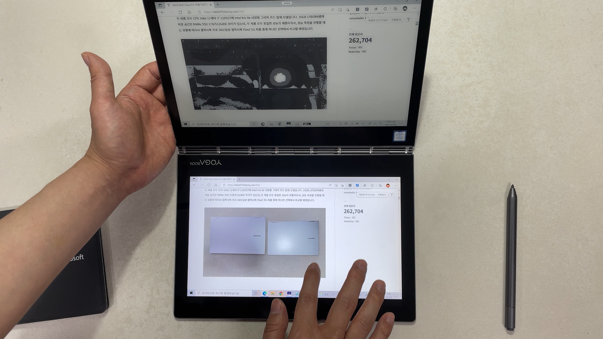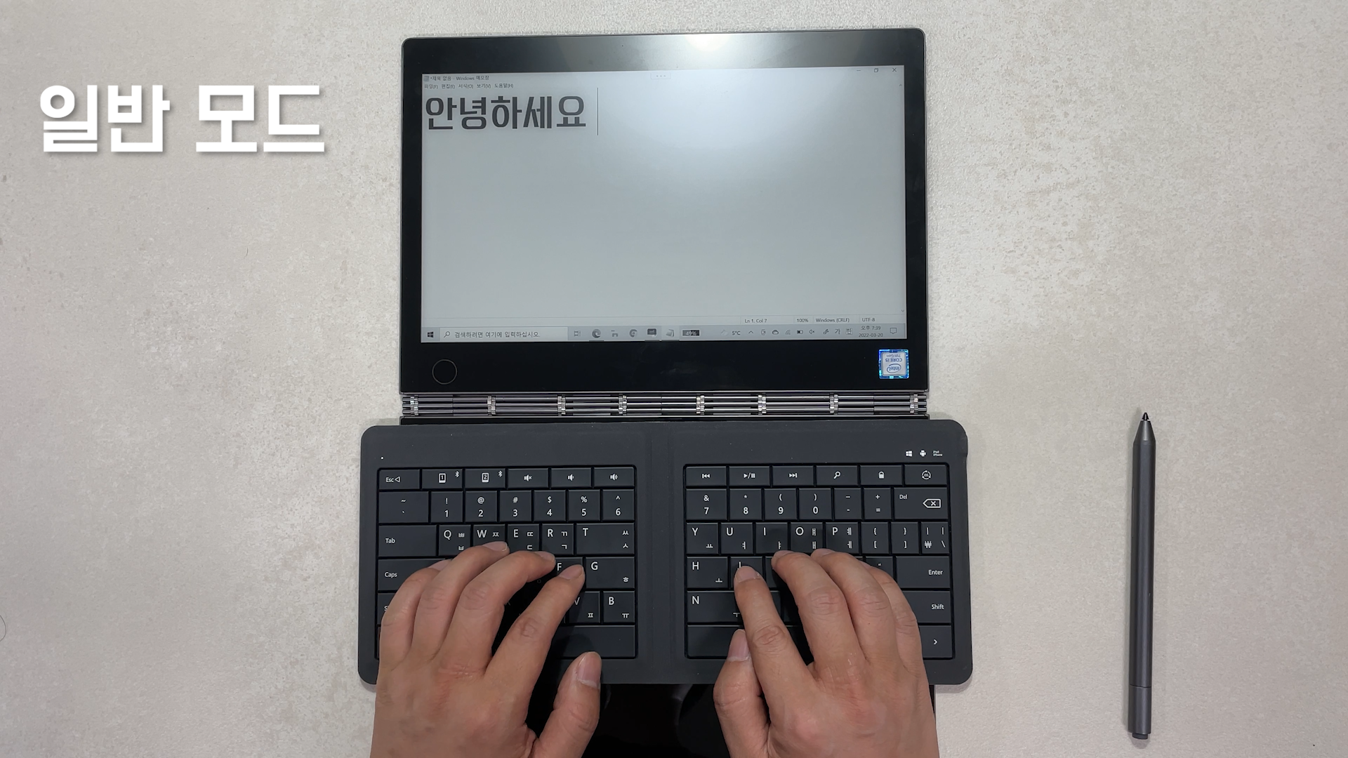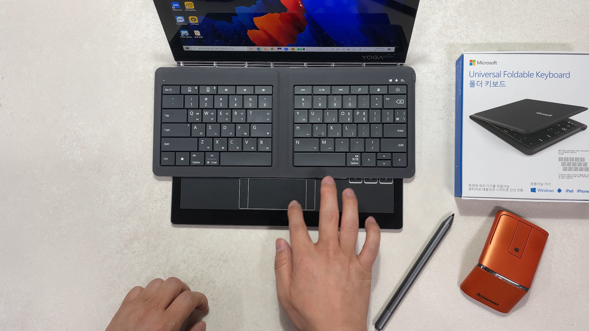그리고 블루투스 키보드를 사용하면 터치패드를 사용하지 못하는 단점이 있는데 이렇게 요가북에 얹어서 사용을 하게 되면 터치패드도 같이 사용할 수 있습니다. 요가북의 터치 키보드는 로그인이나 간단한 인터넷 검색 정도만 사용하고 문서 작업은 물리 키보드 사용을 추천 드립니다.