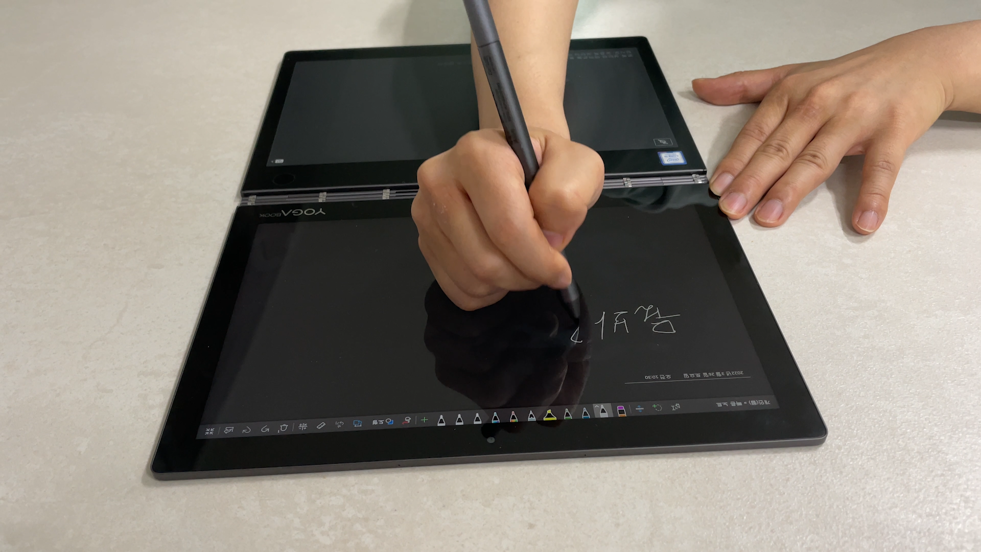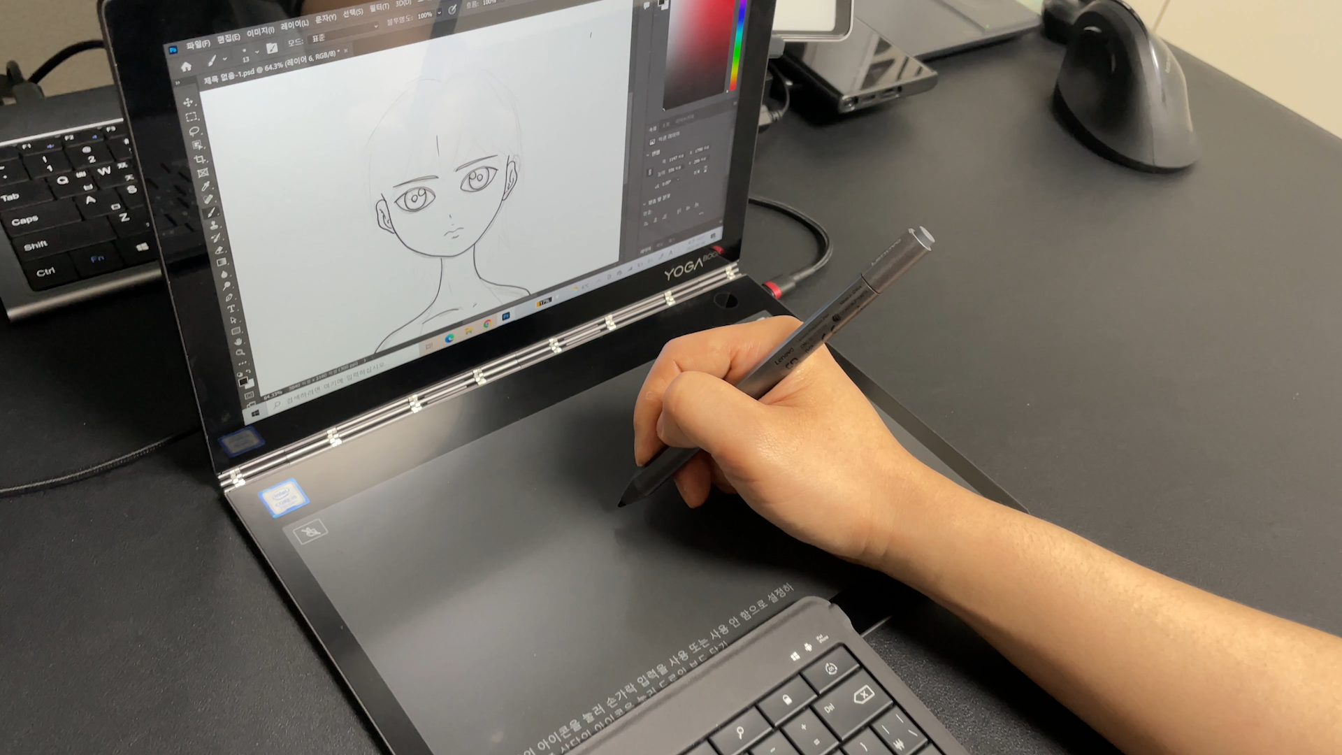 펜 태블릿 기능은 요가북 1세대는 하판 전체를 펜 태블릿처럼 사용하면서 메인 디스플레이에 글씨도 쓰고 그림도 그렸는데요. 이 기능이 요가북 c930에서는 제외되면서 단점으로 지적한 분들도 있었습니다. 이 기능도 업데이트 되면서 요가북 c930의 e-ink 화면 전체를 펜 태블릿처럼 사용할 수 있게 되었습니다. 그림 그리는 분들에게 좋은 소식이죠.