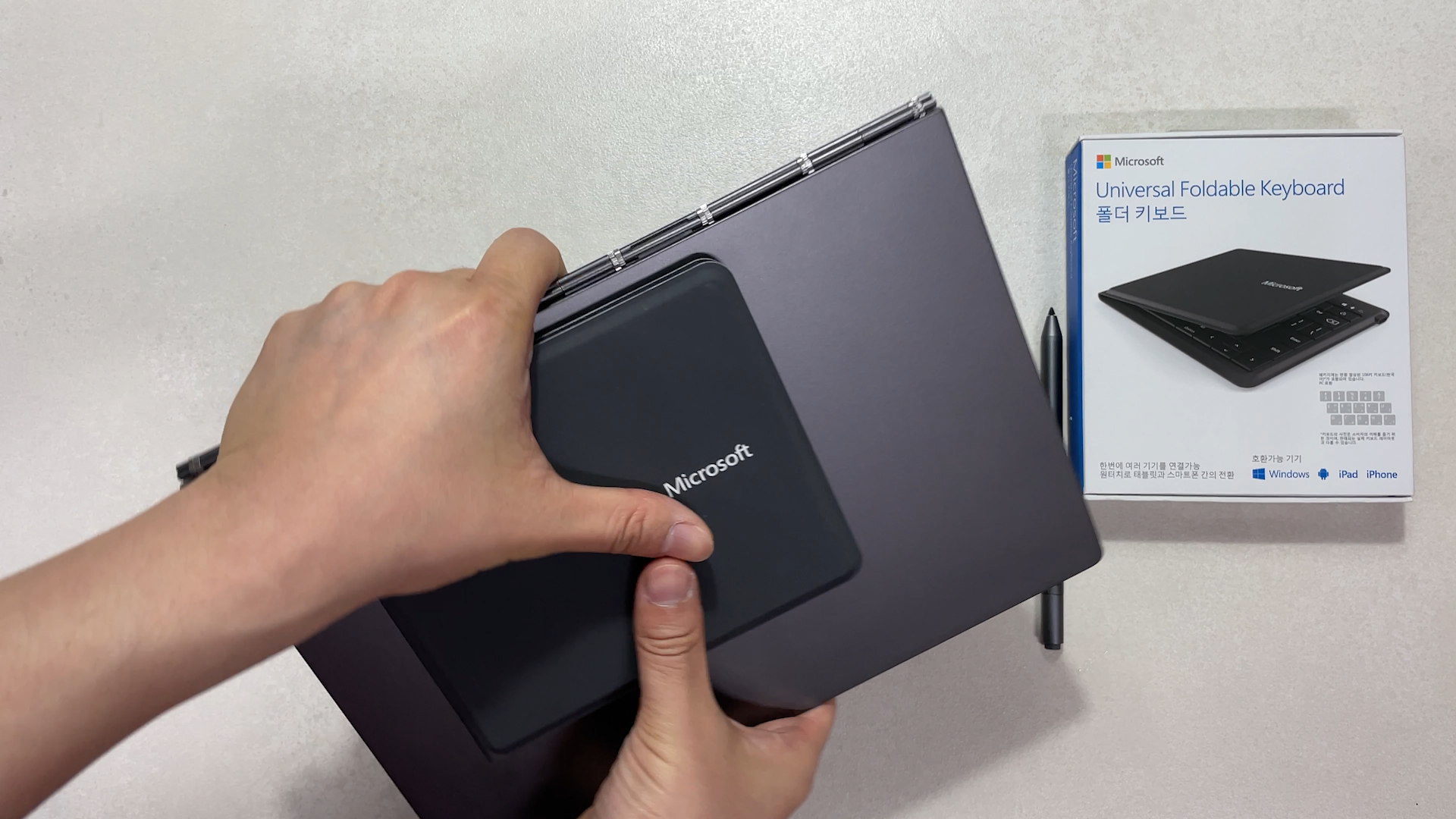 이런 지갑형의 MS 유니버셜 폴더 키보드를 가지고 다니는 게 좋습니다. 함께 들어도 무게감이 없고 지갑형 스타일에 부드러운 재질로 태블릿과 함께 들어도 기스가 나지 않습니다.